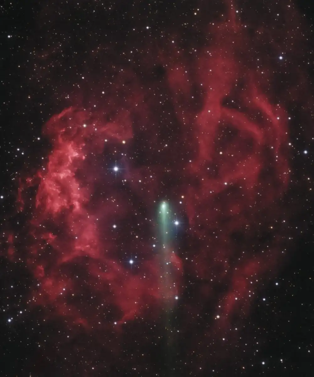 16. Финалист в той же категории — «Космическая роза» Лайонела Майзика. Снимок сделан в Мейхилле (Нью-Мексико, США). «4 октября 2021 года создалось впечатление, что короткопериодическая комета 4P/Фая как бы „расколола“ эмиссионную (самосветящуюся) туманность Sh2-261 в созвездии Ориона. Объект, также известный как туманность Лоуэра, напоминает красную розу, но внешний вид кометы удачно дополнил эту „розу“ „стеблем“, — говорит Лайонел. — Несколько дней спустя, после того, как комета удалилась, я снова навел телескоп на туманность Лоуэра, чтобы зафиксировать более слабые детали. Изображение было получено с помощью роботизированного телескопа iTelescope T11».
