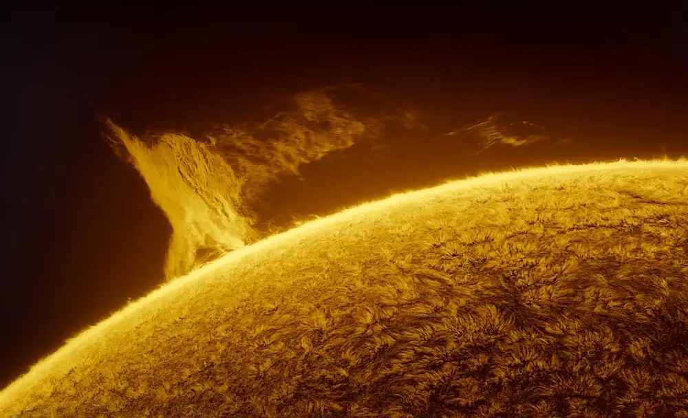 «Гигантский солнечный протуберанец появляется над хромосферой (нижней атмосферой Солнца) лимба (видимого края Солнца). Этот гигант был виден в течение двух дней в феврале 2022 года, а затем взорвался, произведя корональный выброс массы. Я приложил огромные усилия, чтобы за этот короткий период получить как можно больше изображений, — говорит Мигель. — В первый день погодные условия были не идеальными, с моментами средней видимости. Второй день был намного лучше с точки зрения стабильности. Это изображение со второго дня. Согласно моим измерениям, размер этого протуберанца был примерно в десять раз больше диаметра Земли, а простирался он вокруг лимба Солнца на тысячи километров».