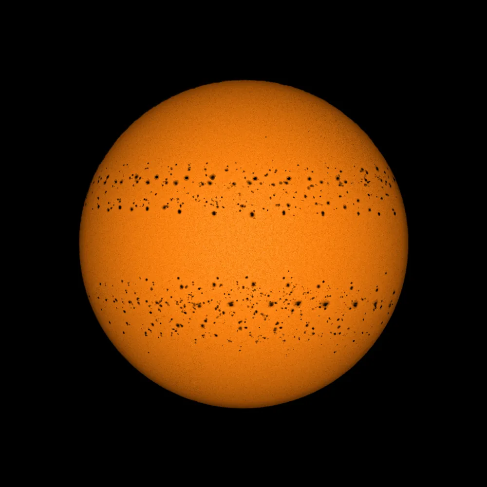 «Я фотографировал Солнце в течение 365 дней с 25 декабря 2020 года по 31 декабря 2021 года, пропустив за этот период всего шесть дней. Целью этого проекта было запечатлеть путешествие одиночного пятна по солнечному диску, но мне удалось его продлить на год, — говорит Сумьядип. — Я объединил изображения, чтобы получилась одна картинка, на которой зафиксировано начало 25-го солнечного цикла. Всего на обращенном к Земле солнечном диске (AR12794–AR12921) появилось 127 активных областей во время этой фазы, и фото показывает, что все солнечные пятна выстраиваются в две полосы на солнечном диске примерно в 15–35° к северу и югу от экватора и постепенно начинают дрейфовать к нему — явление, известное как закон Шперера».