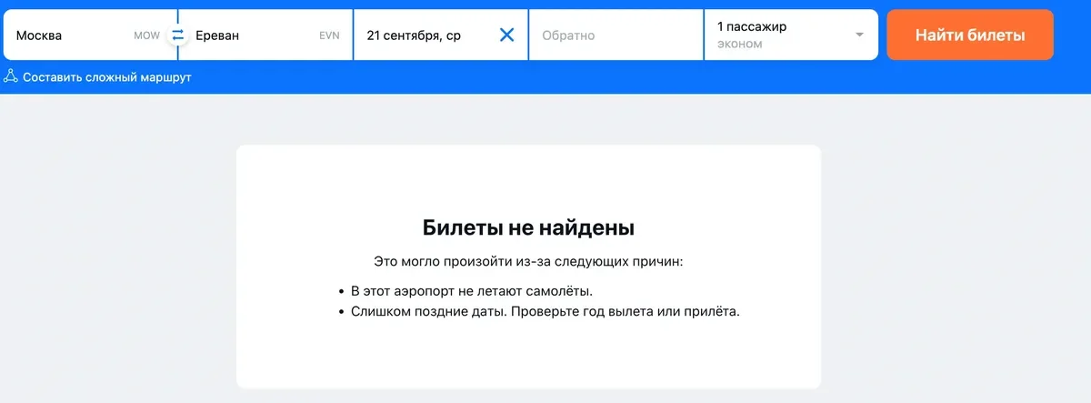 It is impossible to purchase tickets for flights from Moscow to Istanbul, Yerevan and Baku for today. The only ticket from Moscow to Istanbul for 21 September that was offered on the Aviasales website at approximately 2 p.m. cost over 325,000 rubles (€5,300).