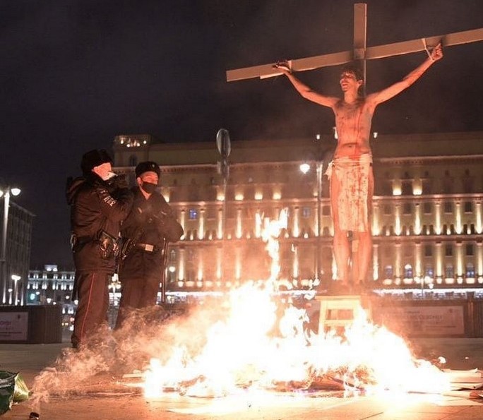 Ноябрь 2020 года. В образе Иисуса Крисевич привязал себя к кресту перед зданием ФСБ на Лубянке. Вокруг себя он раскидал горящие папки с уголовными делами.