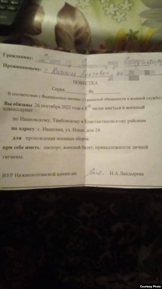 По его словам, резервистам не говорили об Украине, добавив что их повезут в военкомат всех вместе, партией, и с ними поедет юрист. Раздача повесток произошла до того, как президент России Владимир Путин объявил о частичной мобилизации.