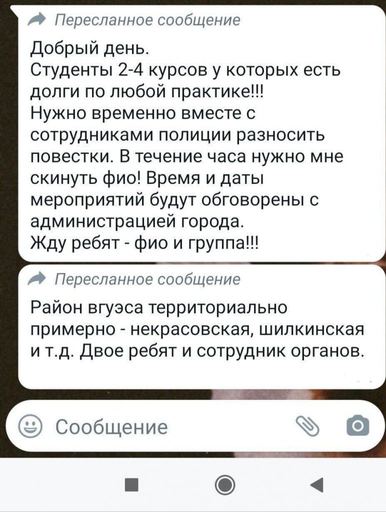 По его словам, соответствующие сообщения, адресованные учащимся 2-4 курсов, у которых есть долги по учебе, рассылаются в групповых чатах учебного заведения.