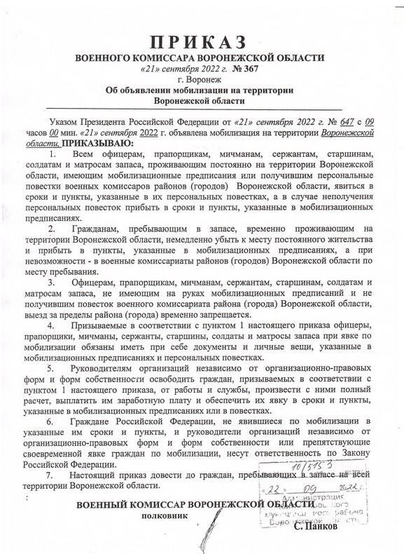 В частности, такое распоряжение отдал военный комиссар Воронежской области.