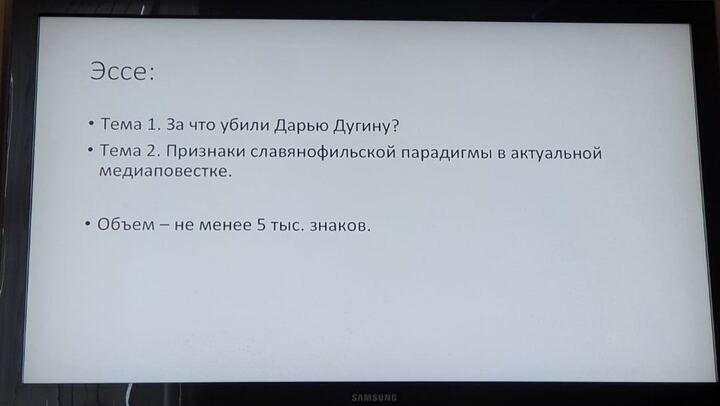 На первом занятии курса по формированию повестки, которое прошло 15 сентября, Слабковская сообщила студентам, что 13 лет работает редактором новостей в ТАСС. На занятии говорили об убийстве дочери философа Александра Дугина Дарьи Дугиной и войне в Украине — преподавательница сказала, что «нельзя хаять свою страну, когда она ведет военные действия».