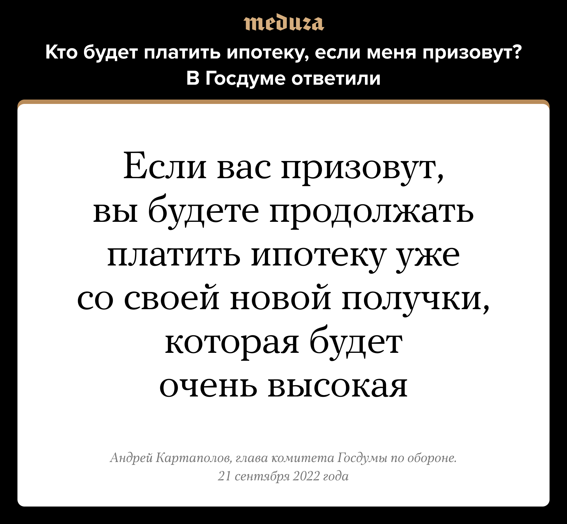 А вот что глава комитета Госдумы по обороне Андрей Картаполов говорил, отвечая на вопрос об ипотеке мобилизованных людей.