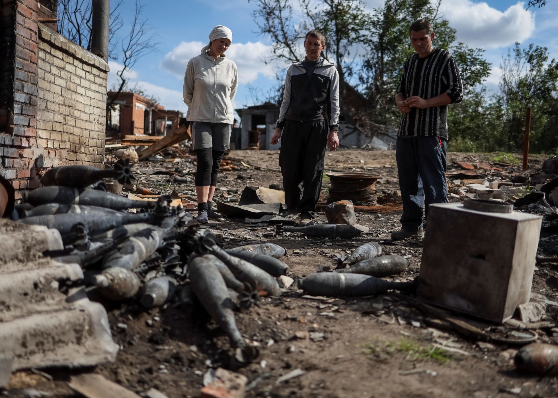 Местные жители стоят возле минометных боеприпасов на разрушенной улице в недавно освобожденном селе Каменка.