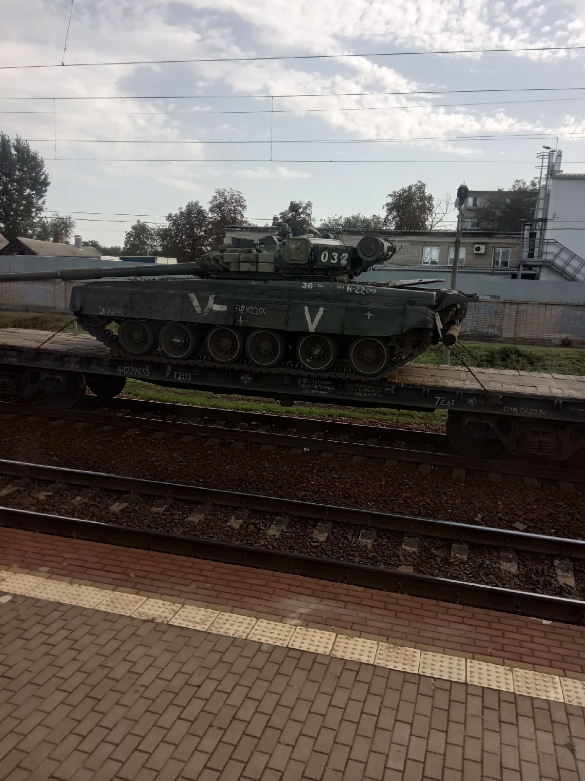 В отличие от Т-62М, которые едут в Украину в "заводском" состоянии, этот танк уже имеет на борту используемую российскими военными в Украине букву "V" и в целом не выглядит как ранее не использовавшийся, хотя и не имеет явных внешних повреждений. Радио Свобода геолоцировало место съемки фото как станцию Каменская в Ростовской области (город Каменск-Шахтинский). Состав стоит на путях, которые обычно используются для следующих в северном направлении поездов, а на платформе написано "Екатеринбург". Можно предположить, что машина следует на ремонт в Омск, где она была выпущена.