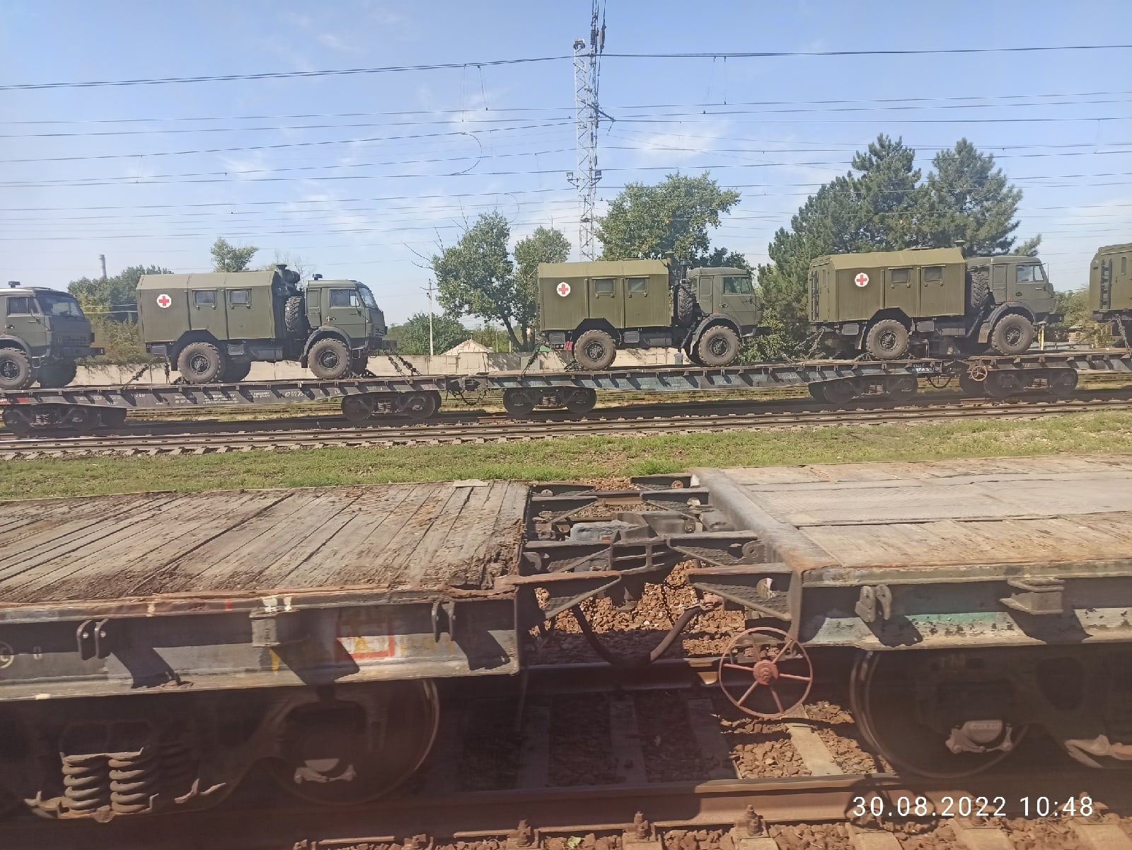 Этот же пользователь тиктока опубликовал и несколько других видео, на одном из которых, в частности, виден состав с военными бортовыми автомобилями "КамАЗ", "Урал" и бензовозами.