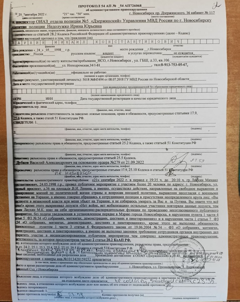 "В итоге мне вменили статью 20.2 часть вторая. Это организация несанкционированного митинга, хотя ничего я не организовывал. И даже из протокола этого не следует. В протоколе указаны лозунги "нет войне, нет мобилизации" и "я не хочу умирать за Путина и за вас". Кто их кричал, не уточняется. К материалам дела приложили видео, будут смотреть, я кричал или нет. Хотя лозунги же в любом случае не означают автоматически, что я что-то организовывал", – Михаил из-за запрета полиции говорить по телефону переходит на переписку.