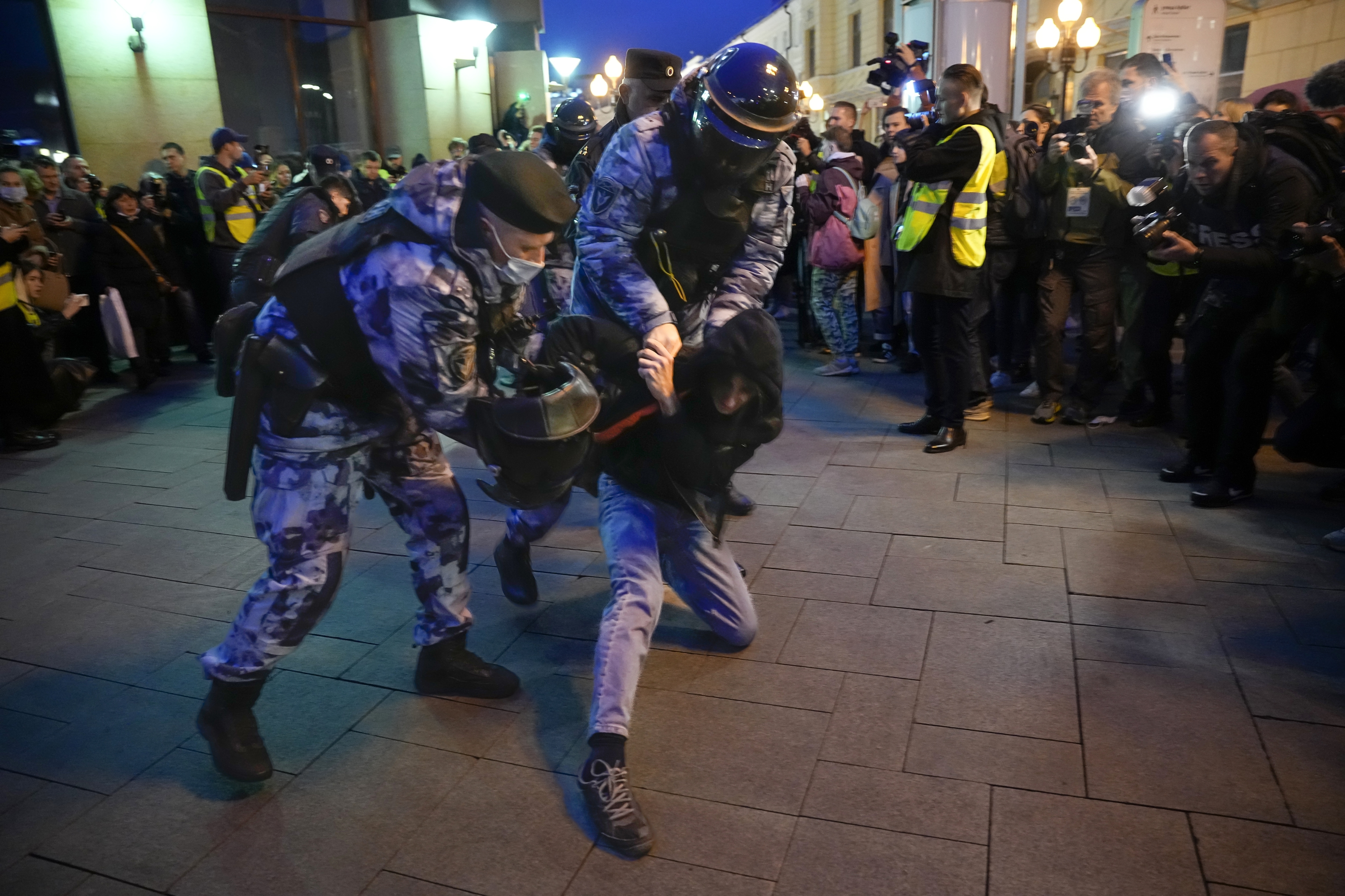 «Российские официальные лица ранее утверждали, что частичная мобилизация коснется только 300 тысяч мужчин и только тех, кто имеет предварительный военный опыт. 22 сентября пресс-секретарь Кремля Дмитрий Песков заявил, что практика вручения повесток задержанным митингующим не противоречит закону о мобилизации от 21 сентября. Угроза Пескова противоречит заявлениям Кремля о том, что он воздержится от мобилизации лиц вне составленных списков резервистов», – говорится в сообщении.