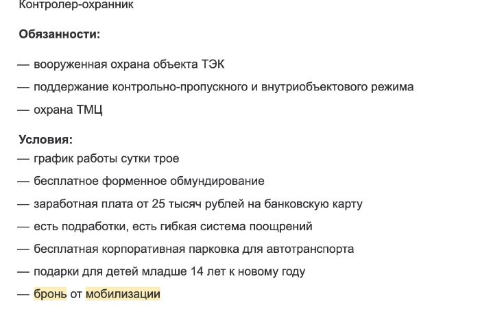 «Бумага» нашла еще три актуальные вакансии с условием освобождения от призыва на сервисе: две в Петербурге и одну в Москве. В двух описаниях обозначено, что работодатель аккредитован как IT-компания и предоставляет ряд льгот, в том числе «бронь от мобилизации».