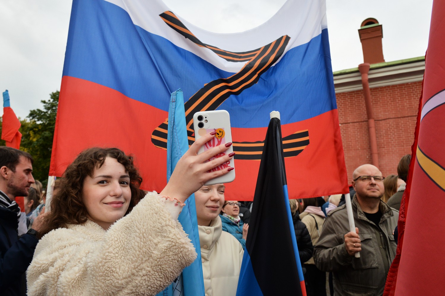В пятницу, 23 сентября, в Петербурге, как и в других городах России, прошел митинг в поддержку «референдумов» в Донбассе, Херсонской и Запорожской областях. По оценке очевидцев, к стенам Петропавловской крепости вышло около 1 тысячи человек, многие из которых стояли с флагами России и Z-символикой.