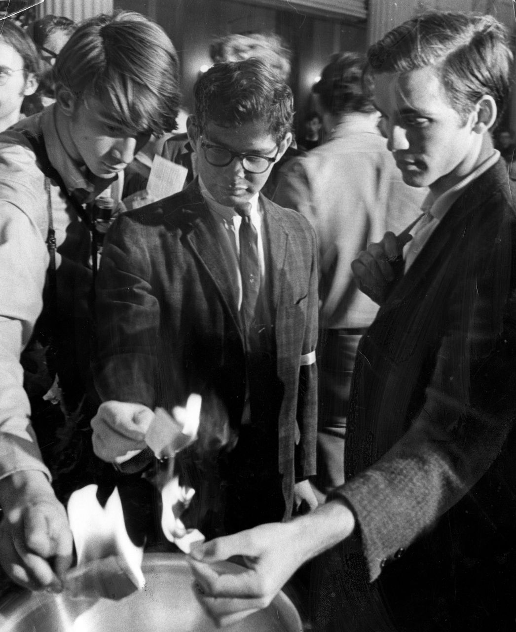 J. Walter Green / AP / Scanpix / LETA США в 1965 году начали полномасштабное вмешательство в военный конфликт во Вьетнаме. Массовый призыв на войну, проводившийся в стране, спровоцировал волну протестов. Недовольство вызывал как сам факт необходимости участвовать в боевых действиях, так и организация призыва. Призывников отбирали по квоте местные комиссии, объективность которых ставили под сомнение, указывая, что они зачастую не призывают людей из обеспеченных слоев населения, а выдают призывные удостоверения представителям этнических меньшинств и людям с невысоким доходом. В знак протеста люди, получившие призывные удостоверения, публично сжигали их. Этот шаг одобряли далеко не все. На фото: толпа на ступенях суда в Бостоне пытается добраться до 18-летнего Дэвида Дэнсона после того, как он и его товарищи сожгли свои призывные удостоверенияStuart Lutz / Gado / Getty Images Протесты против войны во Вьетнаме оказали огромное влияние на развитие общественных организаций в США. Акции проводили многочисленные общественные объединения. На фото: рукописная листовка против войны во Вьетнаме, выпущенная Партией мира и свободы в 1965 годуStuart Lutz / Gado / Getty Images Самодельная листовка с кадрами из антивоенного фильма «Война во Вьетнаме», выпущенная Комитетом за прекращение вторжения США во Вьетнам. Сан-Франциско, Калифорния, 1965 годStuart Lutz / Gado / Getty Images Антивоенный постер организации «Студенты за либертарианское общество» (SLS) с надписью: «Сопротивляйся призыву» и стилизованным изображением горящей призывной карточки. 1965 годSanti Visalli / Archive Photos / Getty Images Сжигание призывных карточек в знак протеста против войны во Вьетнаме получило столь широкое распространение, что конгресс США был вынужден принять поправки, вводящие наказание за их «сознательное уничтожение или порчу». Это решение пытались оспорить в Верховном суде США, ссылаясь на свободу слова и самовыражения. Суд счел наказание законным, но протестующих это не остановило. По данным исследователей протестного движения, не менее 570 тысяч жителей США за время войны во Вьетнаме были признаны так или иначе нарушившими условия призыва, однако обвинения были предъявлены лишь 8,5 тысячи человек, менее половины дел дошло до суда. На фото: группа молодых мужчин сжигает призывные карточки в банке из-под кофе во время демонстрации в Центральном парке Нью-Йорка. 1967 годAP / Scanpix / LETA В Окленде, штат Калифорния, 16 октября 1967 года демонстранты устроили акцию протеста возле сборного пункта, пытаясь заблокировать проход призывников в автобусы. Отправляющимся на войну пришлось идти по полицейскому коридоруAP / Scanpix / LETA «Не идите, не идите!» — выкрикивали демонстранты призывникам, которые отправлялись из Окленда на войну во Вьетнам. Несколько демонстрантов было задержаноJack Manning / New York Times Co. / Getty Images 16 октября 1967 года протестующие против войны во Вьетнаме собрали тысячи призывных карточек и отправили их генпрокурору США. На фото: коробки с карточками несут в почтовое отделение в Нью-ЙоркеJoe Runci / The Boston Globe / Getty Images 16 октября 1967 года в разных городах США прошла организованная студенческими объединениями акция, в рамках которой призывные карточки предлагалось или возвращать призывным комиссиям в знак гражданского неповиновения, или сжигать. Таким образом протестующие собирались сорвать призыв. Одним из мест проведения акции стала унитарная ц