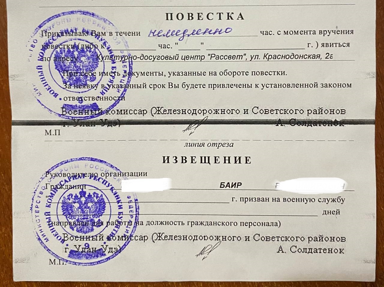 Сразу несколько жителей Бурятии рассказали редакции Сибирь.Реалии о том, что повестки получили их родные, ранее не служившие по состоянию здоровья.