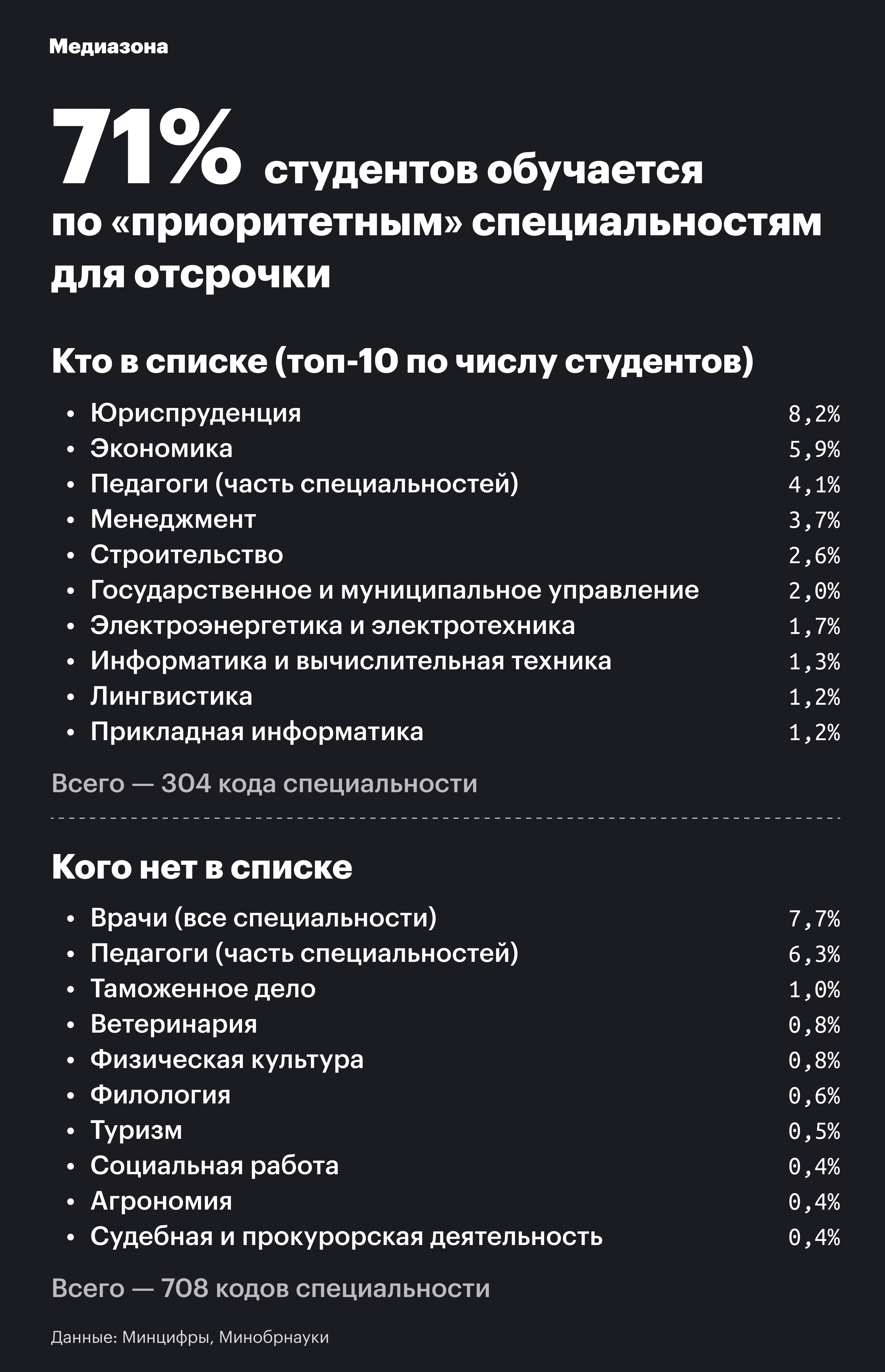 «Медиазона» сравнила этот перечень с последними данными Минобрнауки (2020 год) о количестве обучающихся по всем направлениям во всех российских вузах. На тот момент в России было 4 049 333 студента, из которых 2 886 775 обучались по специальностям из списка тех, кто может получить отсрочку после окончания вуза (на время обучения отсрочку пока обещали всем без исключения).