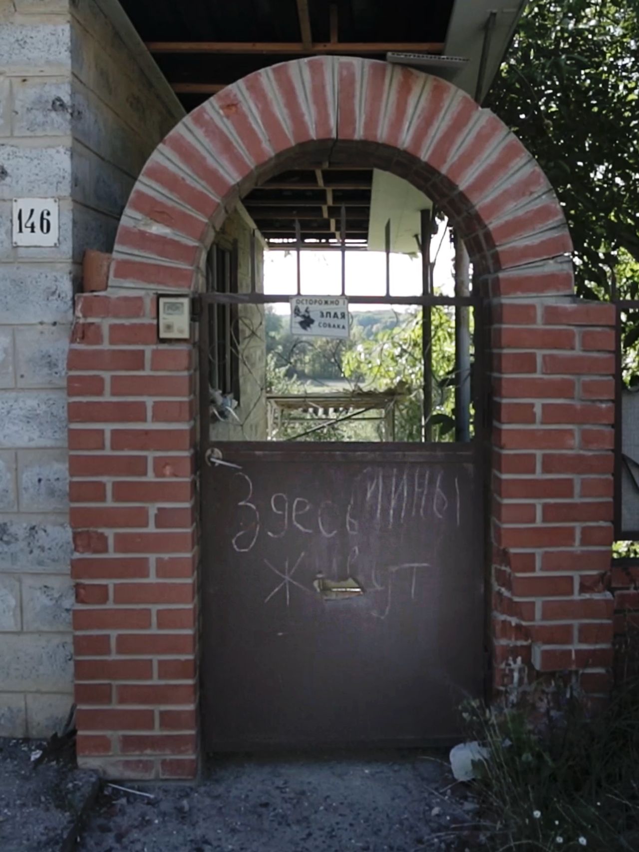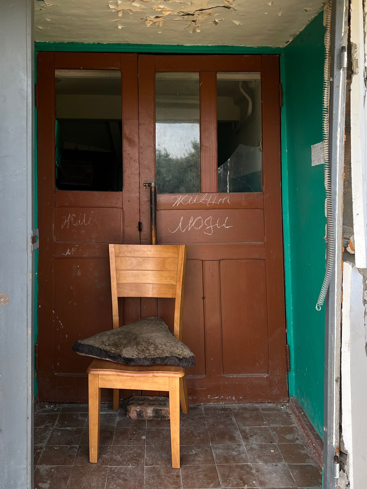 В соседнем доме выбиты все окна и видны следы попадания снарядов. Там живут 13 человек. Возле подъезда сидят и курят двое мужчин. Большую часть оккупации они провели в подвале, иногда выбегали, чтобы собрать выбитые деревянные рамы на дрова для печки и приготовить еду на всех. Одно из окон забито ярко-синим листом ДСП, на нем написано: «Тут живут люди». Это то, что осталось от теннисного стола призера паралимпийских чемпионатов Александра Езыка. Его с трудом удалось эвакуировать из города под обстрелами.
