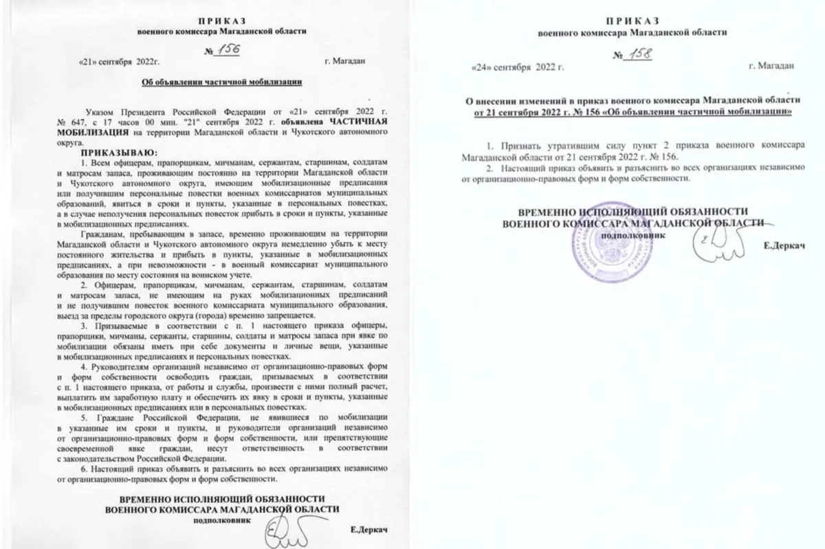После написания новости стало известно, что главой военного комиссариата Магаданской области как минимум с начала мобилизации является временно исполняющий обязанности Евгений Деркач. Именно он подписывал приказ о мобилизации в регионе 21 сентября. Последний его указ вышел накануне.