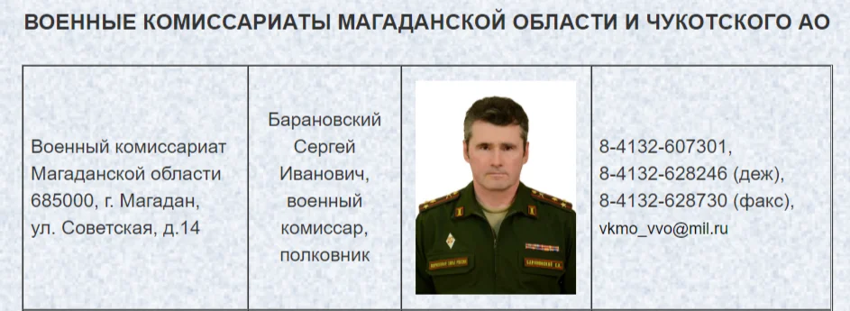 При этом на официальном сайте военного комиссариата Магаданской области военкомом по региону все еще значится Сергей Барановский.