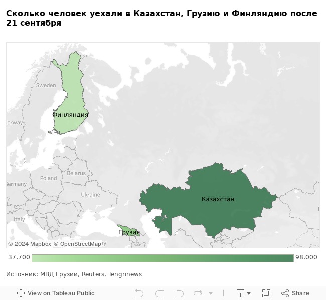Ранее «Новая Газета. Европа» писала со ссылкой на данные в ФСБ, полученные от источника в администрации президента, что с 21 по 24 сентября из России выехали 261 тысяча мужчин. По подсчетам «Бумаги», с 21 по 27 сентября, из России — только в три страны, отчитавшихся о количестве прибывших, — выехало минимум 188 тысяч человек.