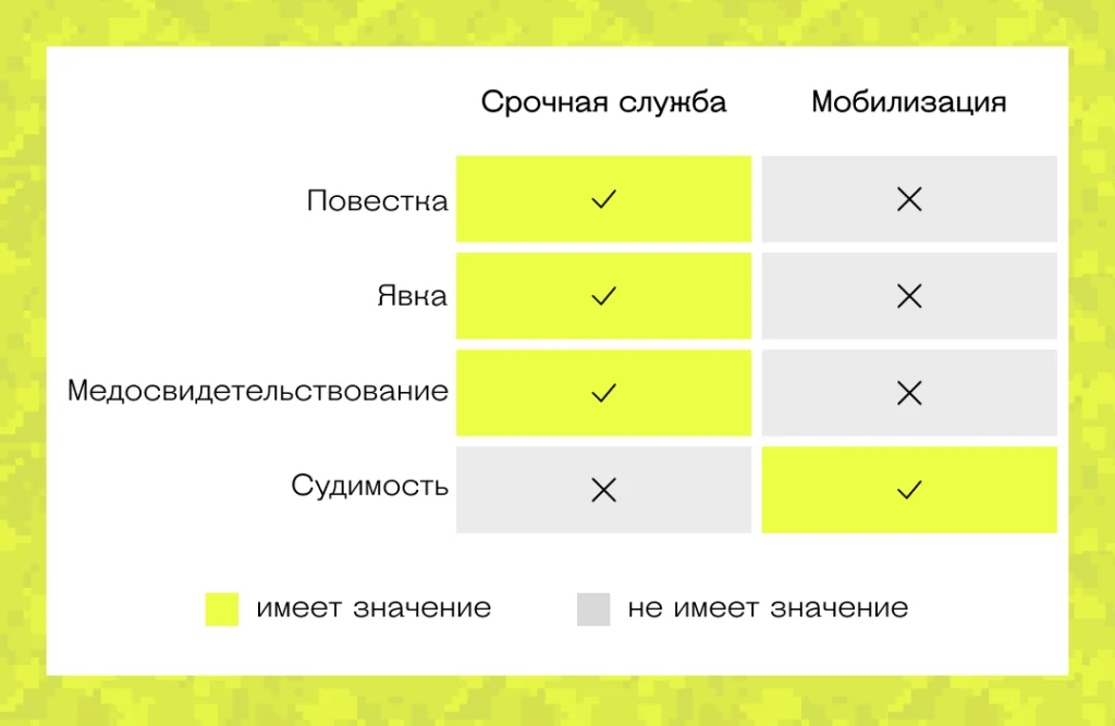 Ещё одним явным отличием срочной службы от службы по мобилизации становится прохождение медицинского освидетельствования. В случае с мобилизацией ни в одном из нормативных актов не прописана необходимость его прохождения. При этом в Положении о призыве по мобилизации указано, что в состав призывных комиссий входят в том числе врачи.