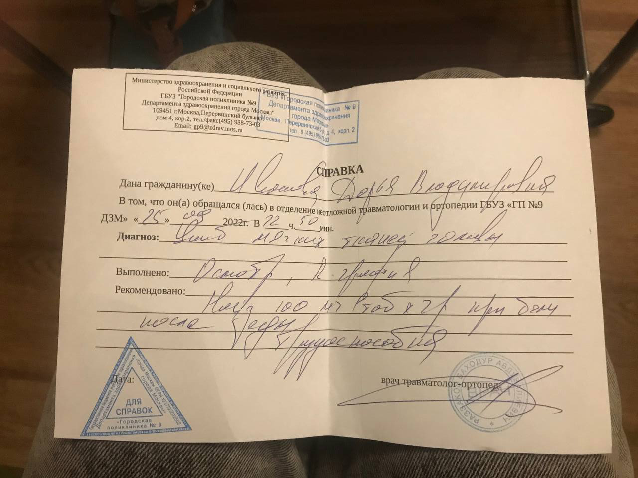 Физически пока сложно сказать, есть ли последствия. У меня стала часто болеть голова. Не знаю, может, это от перенапряжения или погоды, но болит именно в месте удара — то место, которым меня ударили об стол. Я сходила в травмпункт, там мне дали справку о том, что у меня ушиб мягких тканей.
