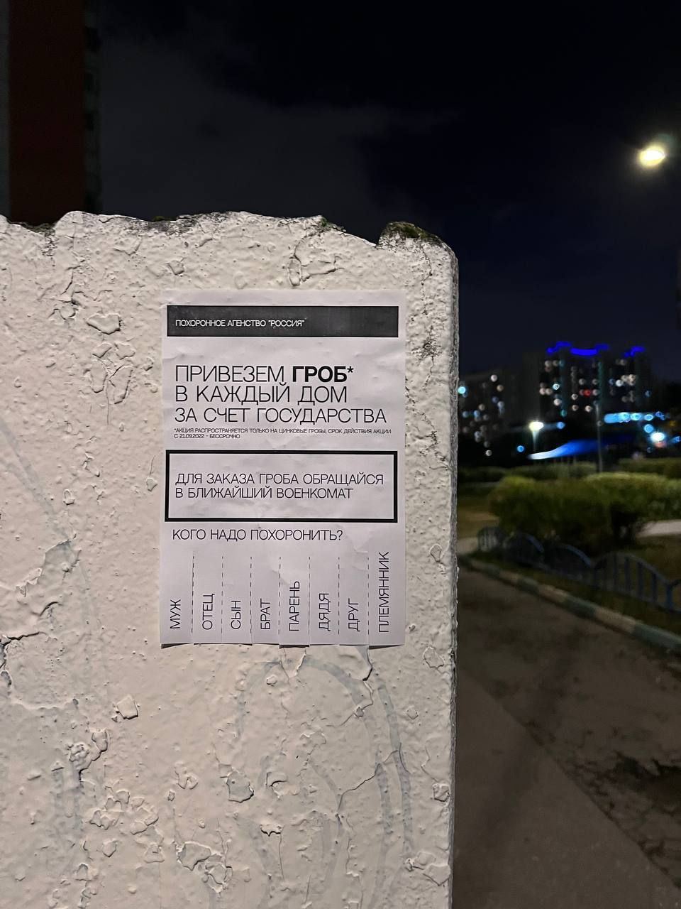 25 сентября Дарья Иванова и провели 11 часов в ОВД «Люблино» — утром силовики приехали по их домашним адресам, чтобы задержать девушек за расклейку антивоенных листовок: «Привезем гроб в каждый дом за счет государства. Для заказа гроба обращайся в ближайший военкомат. Кого надо похоронить? Мужа, отца, сына, брата?».