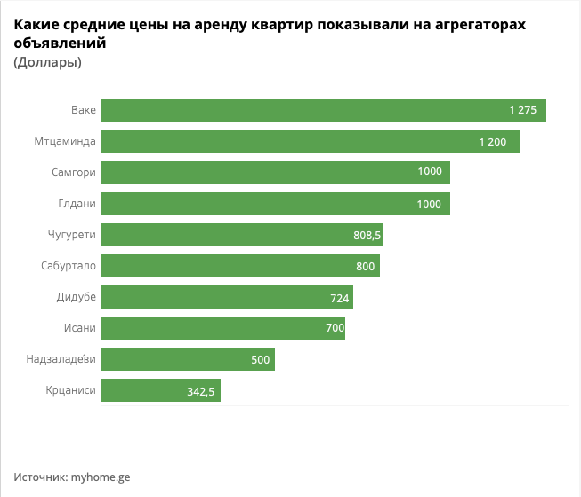 По данным агрегатора объявлений об аренде квартир myhome.ge, в среднем цены на жилье остались на уровне начала войны. Квартира в Ваке и Мцтаминде стоят 1,2 тысячи долларов, в Гладни и Самгори — 1 тысячу долларов, Чугурети — 809 долларов. Самые дешевые квартиры Paper Kartuli обнаружила в Крцаниси, там они могут обойтись в 343 доллара. Единственная аномалия связана с районом Сабуртало, где были обнаружены апартаменты за 1,8 тысячи долларов.