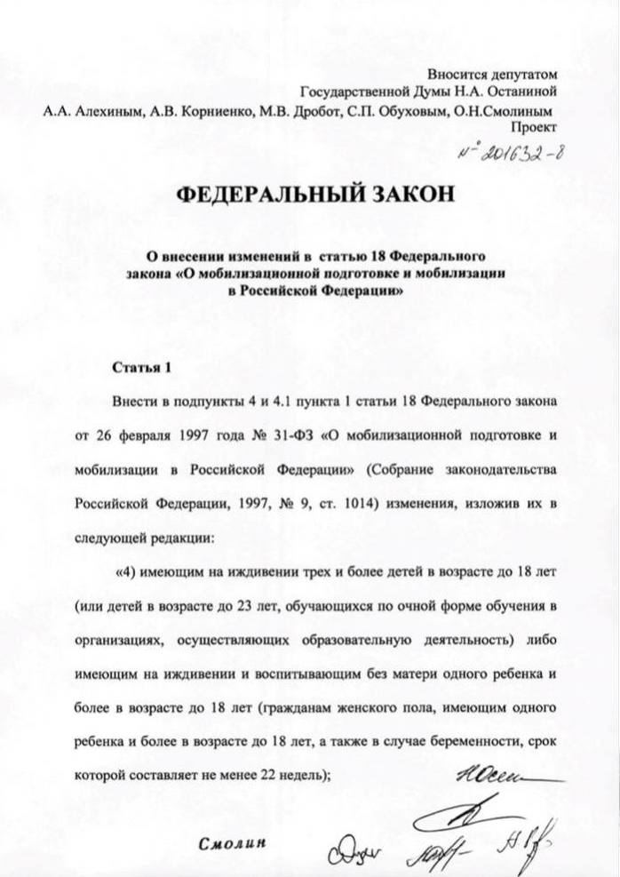 Кроме того, в документе предлагают освободить от «частичной мобилизации» мужчин, которые воспитывают двоих детей и жены которых находятся минимум на пятом месяце беременности.
