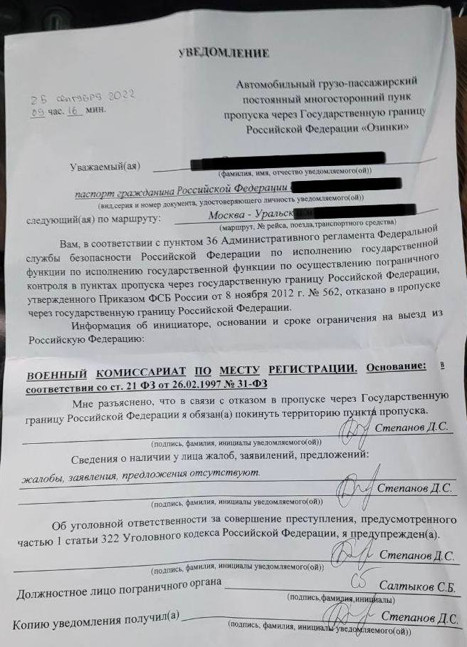 О каких запретах идет речь. Через несколько дней после объявления мобилизации в России пограничники начали отказывать в выезде за границу некоторым гражданам. Россиянам выдавали уведомления, что они не могут покинуть страну по решению военкомата. Например, в разговоре с «Бумагой» петербуржец сообщил, что при попытке пересечь границу с Грузией ему отказали в выезде сказали: «Не служили? Значит, научим!»