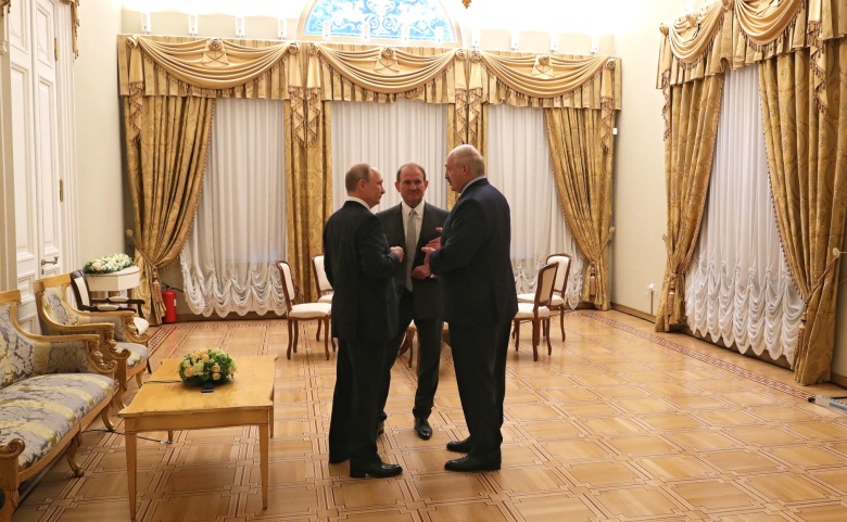 Президент России Владимир Путин с Президентом Белоруссии Александром Лукашенко и главой политсовета украинской партии «Оппозиционная платформа – За жизнь» Виктором Медведчуком, 18 июля 2019 года