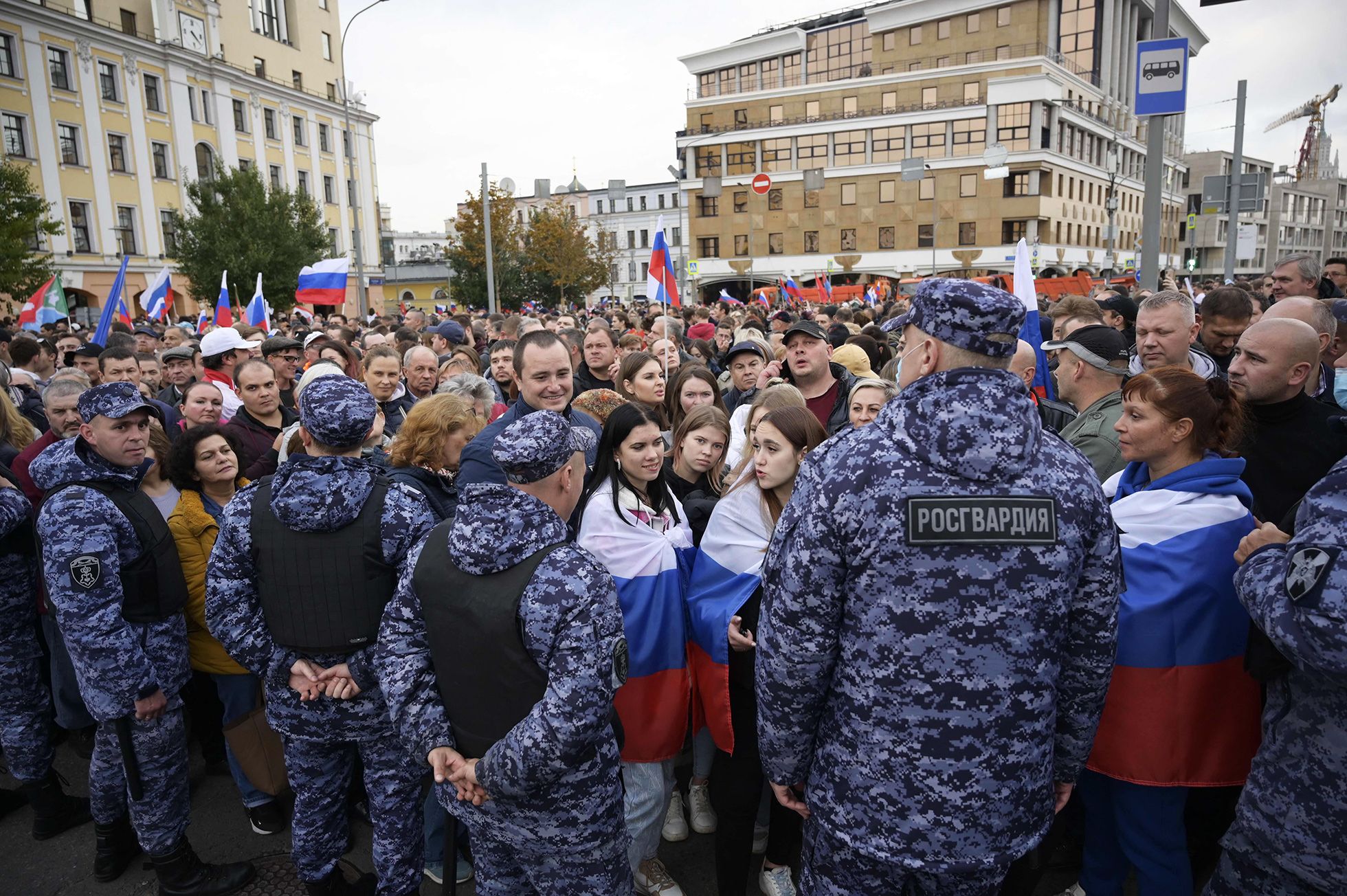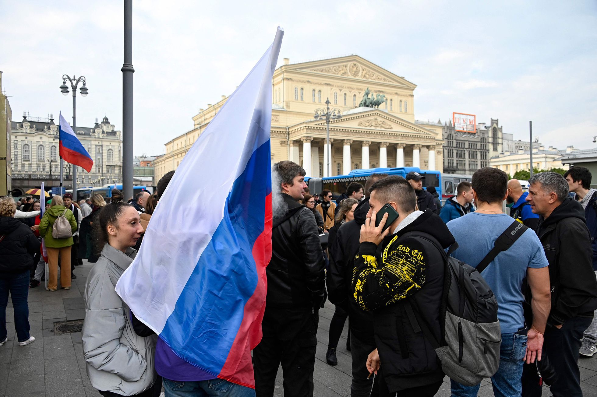 Добраться до самой площади тоже непросто: ближайшие выходы метро закрыты. Приходится делать крюк, проходя мимо небольших группок москвичей с российскими триколорами. У некоторых на верхней одежде виднеются наклейки с надписями: «Z — своих не бросаем».