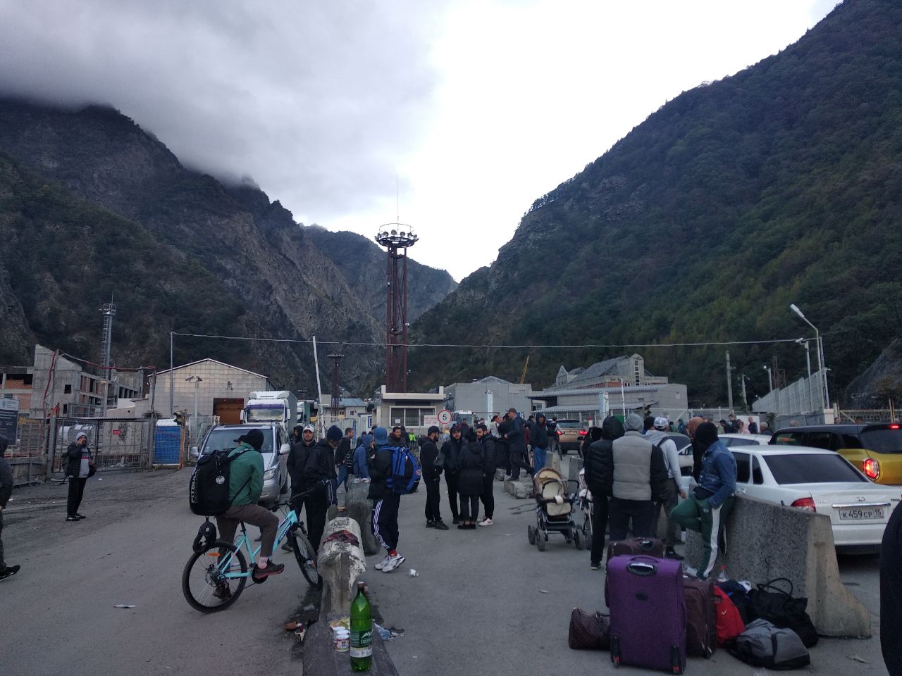У КПП на Верхнем Ларсе перед нами встала другая проблема: как попасть на территорию самого погранпункта. Границу можно пересекать только на транспортном средстве (впоследствии из-за большого потока людей был разрешен пеший переход. – СР), которым считается автомобиль, велосипед или самокат, последними тут же на месте бойко торговали местные жители. В день, когда мы переходили границу (25 сентября), велосипед стоил 20 тысяч рублей, а на самокатах уже не пускали, поэтому добравшиеся до КПП пытались продать их за любые деньги.