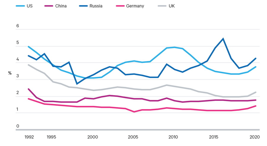 Источник: База данных SIPRI по военным расходам (2022). Поразительно, что несмотря на экономические трудности последних трех десятилетий России удавалось выделять на оборону почти такую же долю экономического производства, как США, и даже более высокую долю, чем Китай, хотя в обеих этих странах экономическая обстановка была более спокойна.