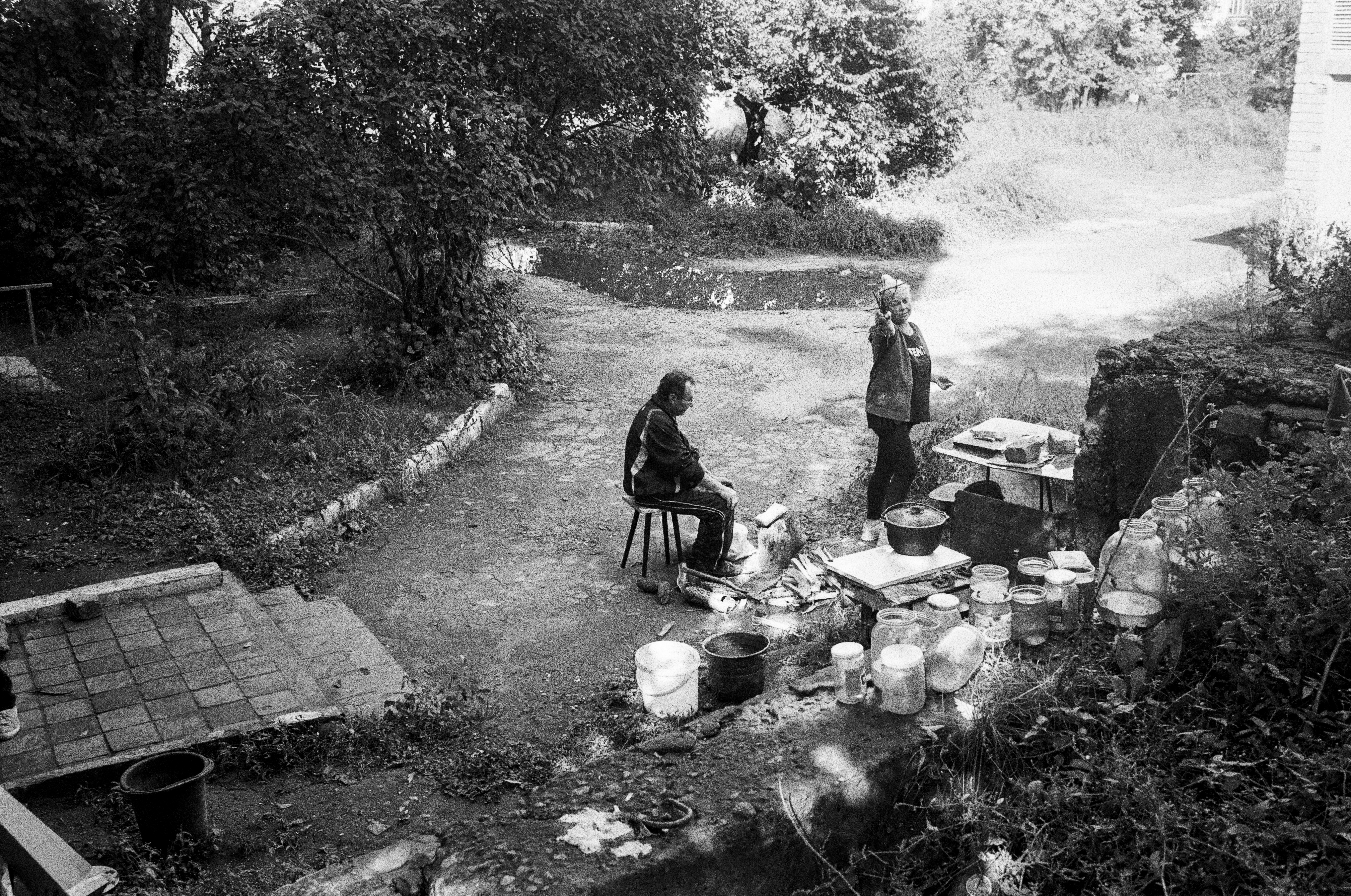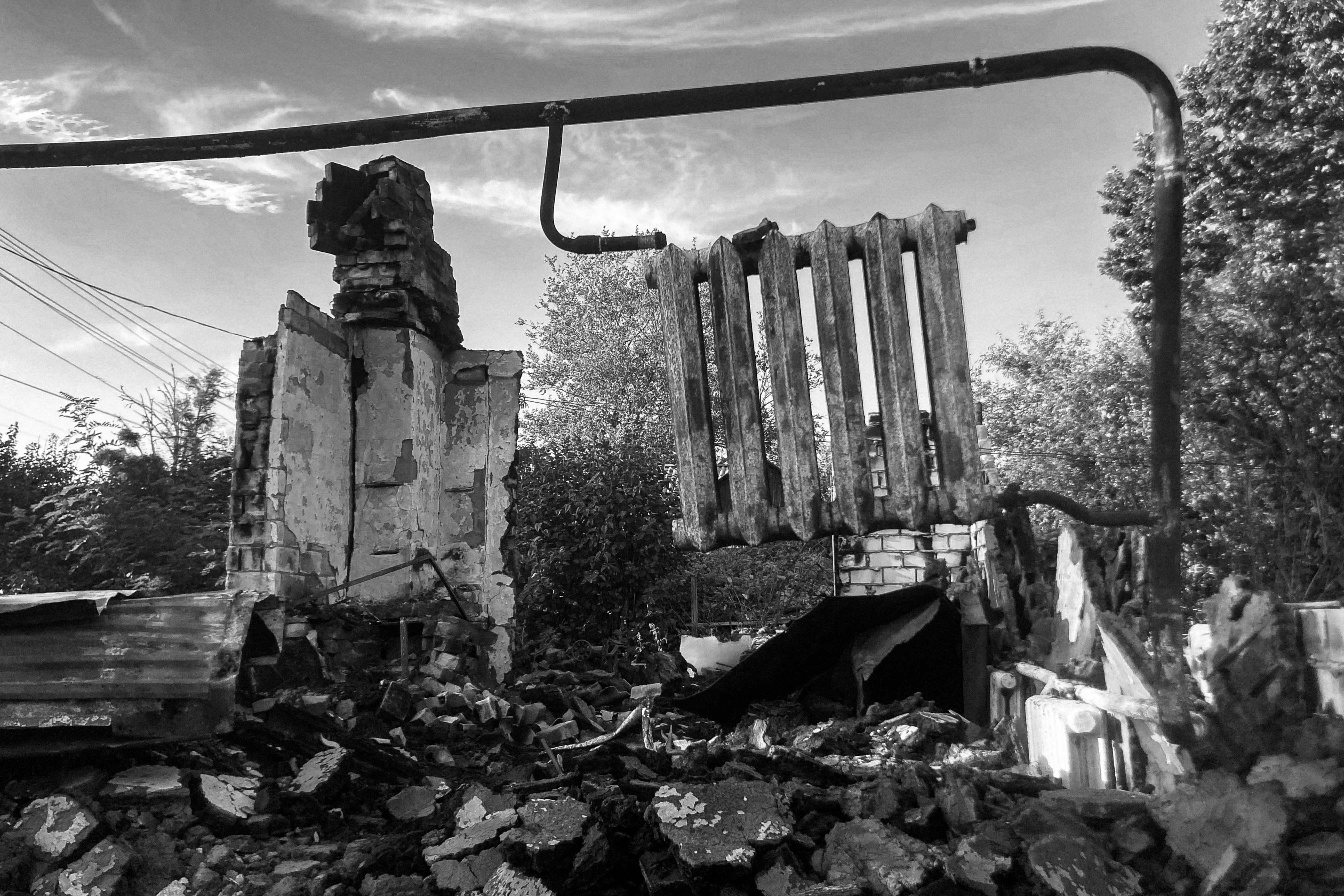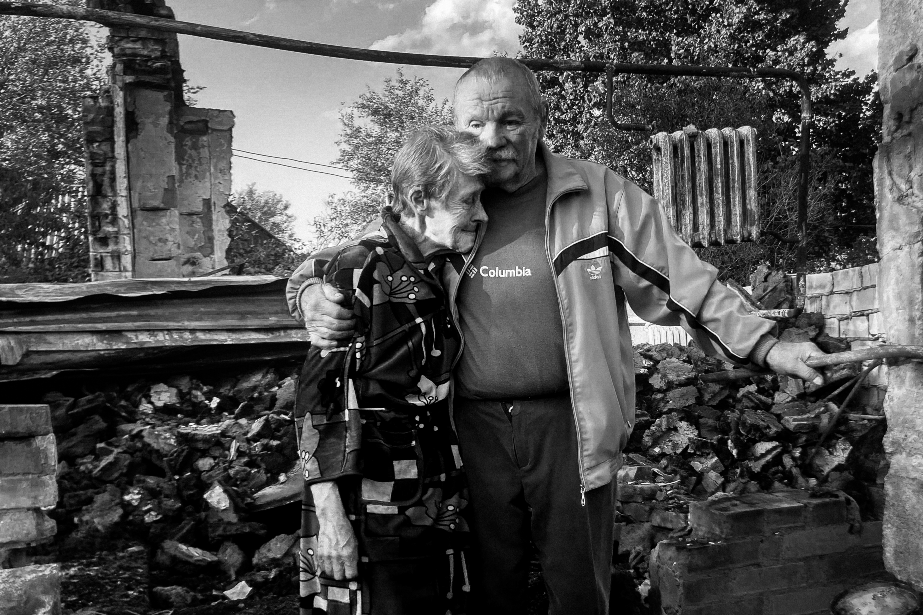 Я говорю: "Мы горим! Ты в порядке?" – "В порядке". Он выскочил. Ну а воды же нету. А оно с подвала перекинулось на каштан. И на дом пошло. Всё! Сразу! Какой каштан! Вы бы видели, деточка, какой каштан! Если бы была вода, то можно бы потушить. Я на улицу вышла, кричу... Женщина какая-то шла, водичку на велосипеде везла. Та сколько той водички. "Ой, Боже! Шо ж... Чем я могу вам помочь?" Я говорю: "Вызовите, кажу, эту... пожарку". В подвале телефоны и документы наши в портфеле были сложены – все сгорело, ничего нет. Вся память. Все альбомы погорели. Ты никто, никак тебя не зовут. И деньги все сгорели. Вот тут, где батарея, тут ванна была у нас. Хай у нас душа не было, а ванна была, АГВ. Ну всё старенькое оно было, но жить можно. Четыре комнаты, прихожая, тут кухонька, там – зала, там – спальня детская. Телевизор был "Самсунг", дорогой, мы его тоже в подвале прятали. Вообще ничего у нас не осталось. Мы ночевать теперь до соседки ходим, а днем все здесь – то постирать, то кошку покормить. Иногда тяжеловато бывает – во мне весу сейчас тридцать восемь килограмм, куда уж меньше, и язвы обострение, маслице нужно есть, я в больнице когда лежала, нам давали такие кубики маслица, булочку или там хлебушек намажешь... это с чайком. Ну кофе тоже можно немножко. Но только чтоб обязательно молочка туда. А грошей-то нет. Толя, принеси кавунчик, хай Викочка попробует, – мы вот посадили, а они не очень сладкие что-то, война, она и на растения действует, – может, вот этот получше будет, порежу сейчас, а Толя у меня, знаете, объездил весь Советский Союз бывший, монтажник оборудования пищевой промышленности был, а я акушеркой много лет работала, лялечек принимала.