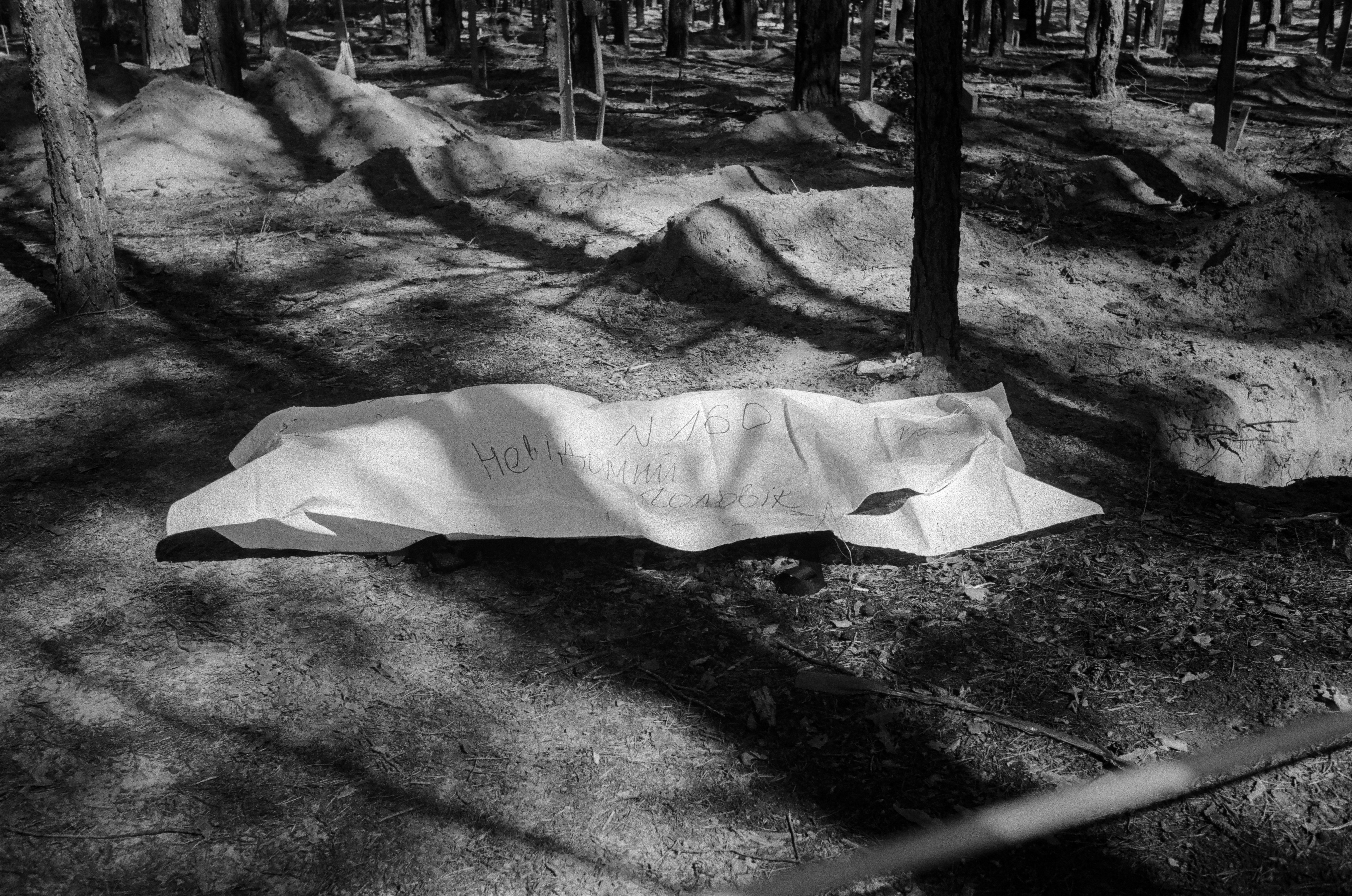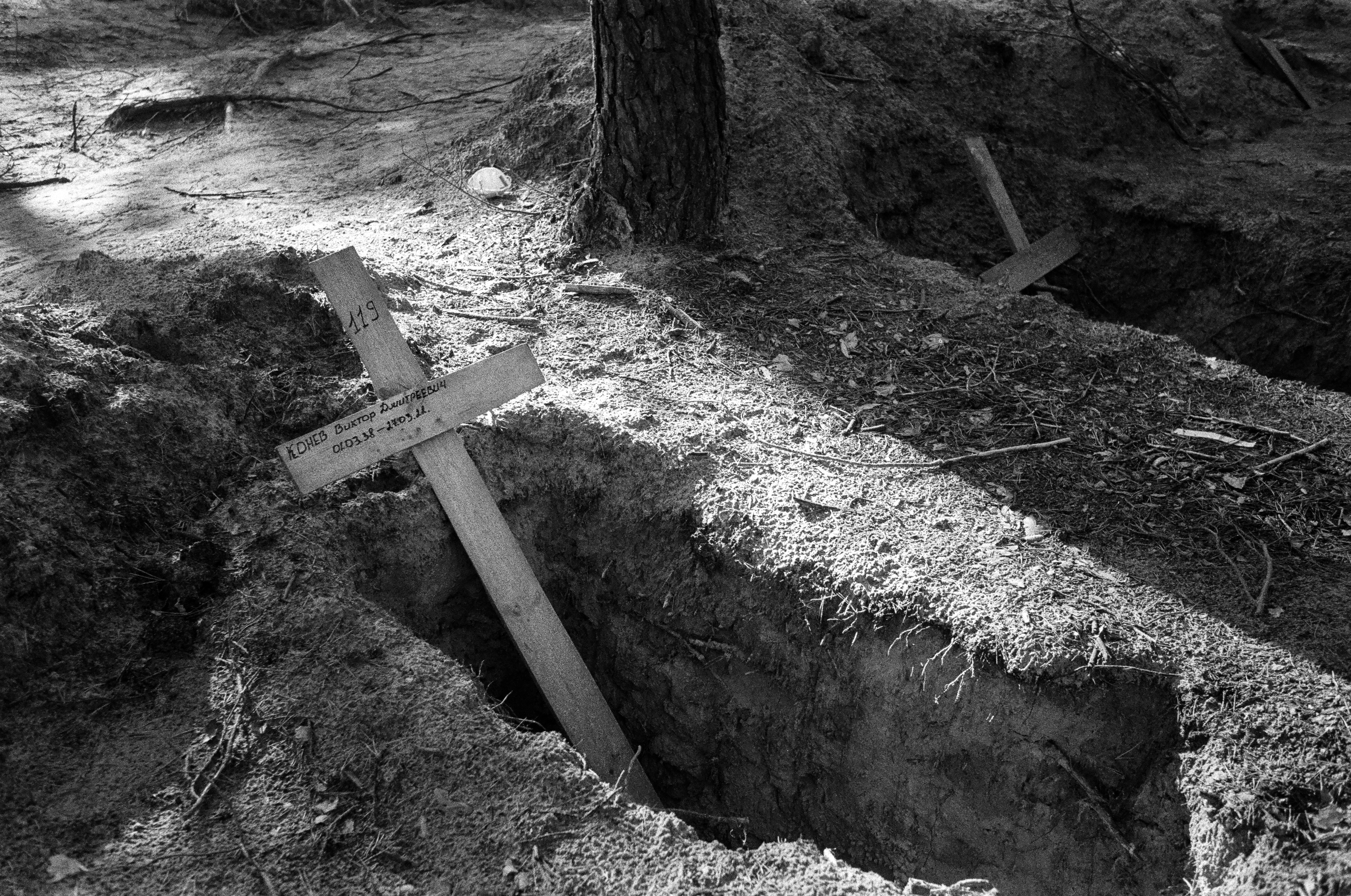 На моих глазах люди в белых одеждах выкапывают человека, похороненного с рюкзаком за спиной. У него нет ни имени, ни фамилии. Только полуистлевший рюкзак и номер на могильном кресте. Человека кладут в белый пластиковый мешок. Плотно застегивают молнию. Подписывают "Невiдомий чоловiк" – неизвестный мужчина.