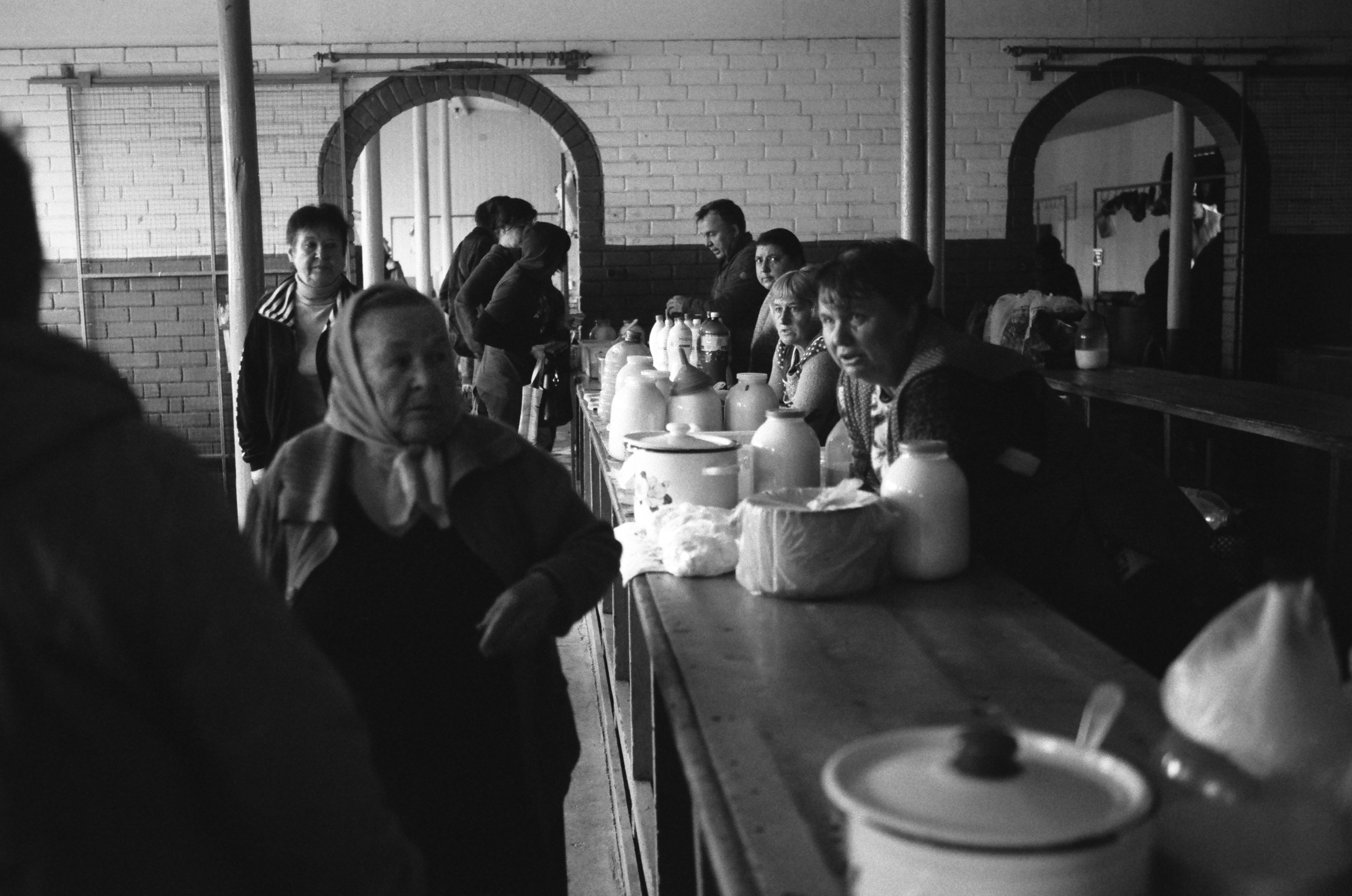 Танк с украинским флагом стоит и на площади рядом с бело-голубым Свято-Вознесенским собором. Рядом с танком – постоянная очередь за гуманитаркой. Везут ее много, гражданские и военные, раздают в разных сторонах города, но хватает далеко не всем. Около собора идет небольшая торговля – старик продает роскошные белые грибы, собранные утром где-то поблизости, женщина рядом – яблоки и варенье.
