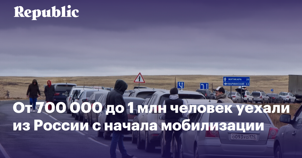 После объявления мобилизации из России уехали от 700 тысяч до 1 млн человек, сообщает сегодня Forbes со ссылкой на источник в администрации президента РФ и неназванного собеседника, знакомого с кремлевскими оценками. При этом отмечается, что пока не представляется возможным выяснить, какое количество уехавших покидают страну с туристическими целями..