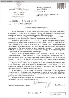 Заместитель прокурора города в ответ на обращение депутата написал, что у администрации СИЗО не было возможности установить в камере холодильник и вентилятор. При этом он уточнил, что нарушалось право Украинцева на санитарную площадь (каждому заключенному на нее полагается четыре квадратных метра), добавив, что виновные уже привлечены к дисциплинарной ответственности.