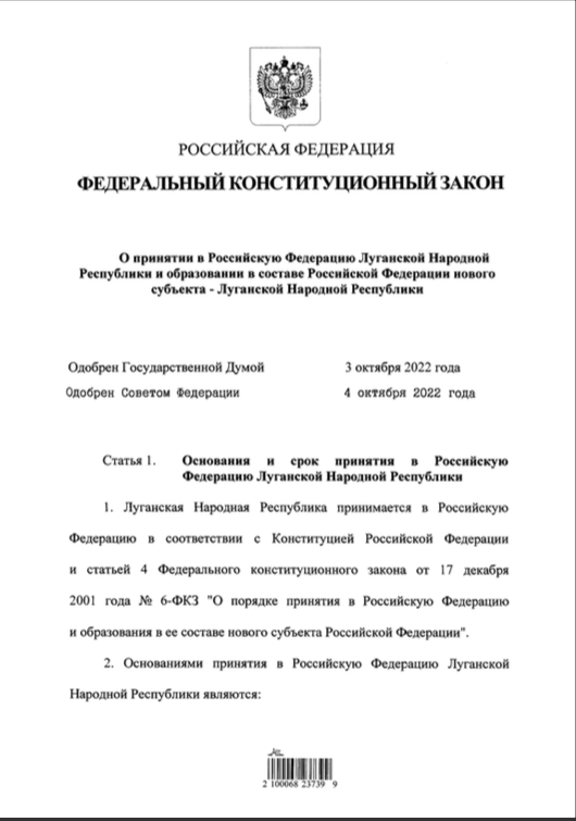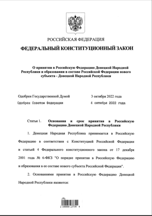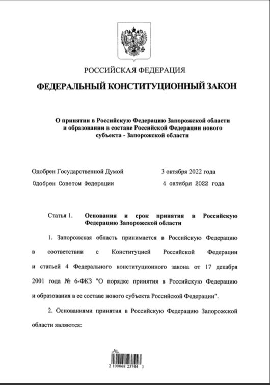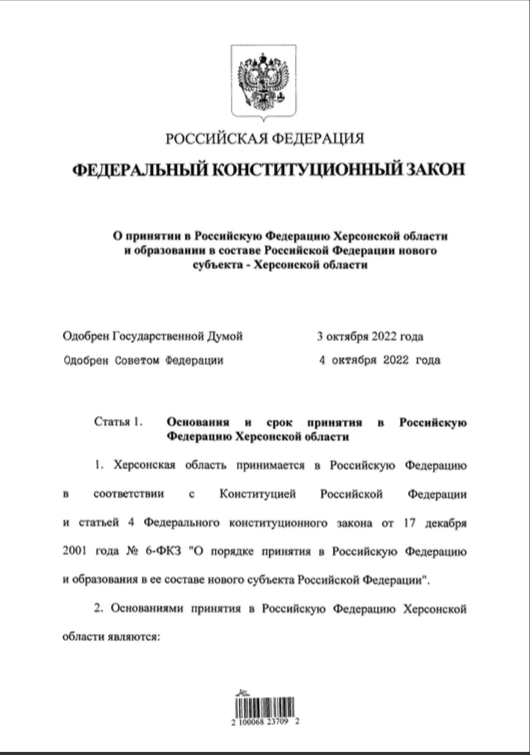 Президент России Владимир Путин подписал федеральные законы, которые признают договоры о «принятии» в Российскую Федерацию оккупированных территорий — самопровозглашенных ДНР и ЛНР, а также Запорожской и Херсонской области в Украине. Законы опубликованы на официальном интернет-портале правовой информации.