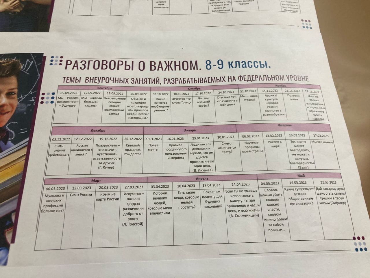 В некоторых школах не говорят об Украине. Ученица другой петербургской школы рассказала «Бумаге», что «Разговоры о важном» 3 октября никак не были связаны с аннексией оккупированных территорий Украины. Вместо этого школьники обсуждали качества, которые необходимы современному учителю. Помимо этого, школьница предоставила учебный план уроков, согласно которому темы занятий никак не связаны с Украиной.