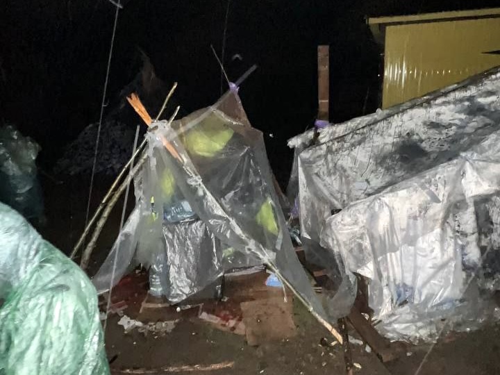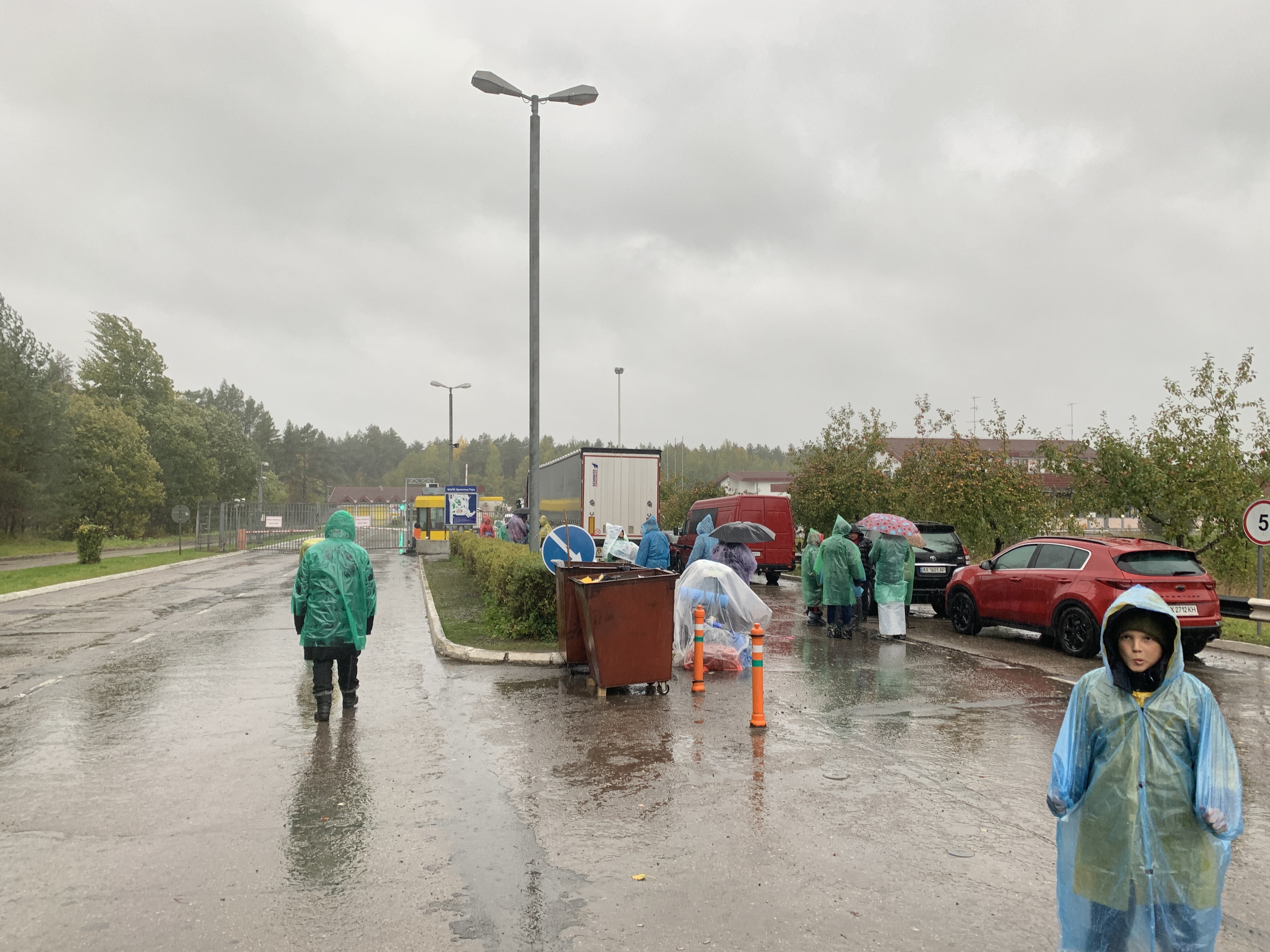 Перед шлагбаумом, ведущим на нейтральную территорию, беженцы построили "лагерь", чтобы укрыться от проливного дождя. Вдоль дорог стоят вещи, накрытые пленкой, из этой же пленки и подручных средств делают импровизированные палатки. Люди ходят в разноцветных одноразовых дождевиках поверх одежды и замотанных целлофановыми пакетами ботинках, чтобы ноги не промокали. Больше повезло тем, кто приехал на машине, они по возможности помогают укрыться от дождя остальным.