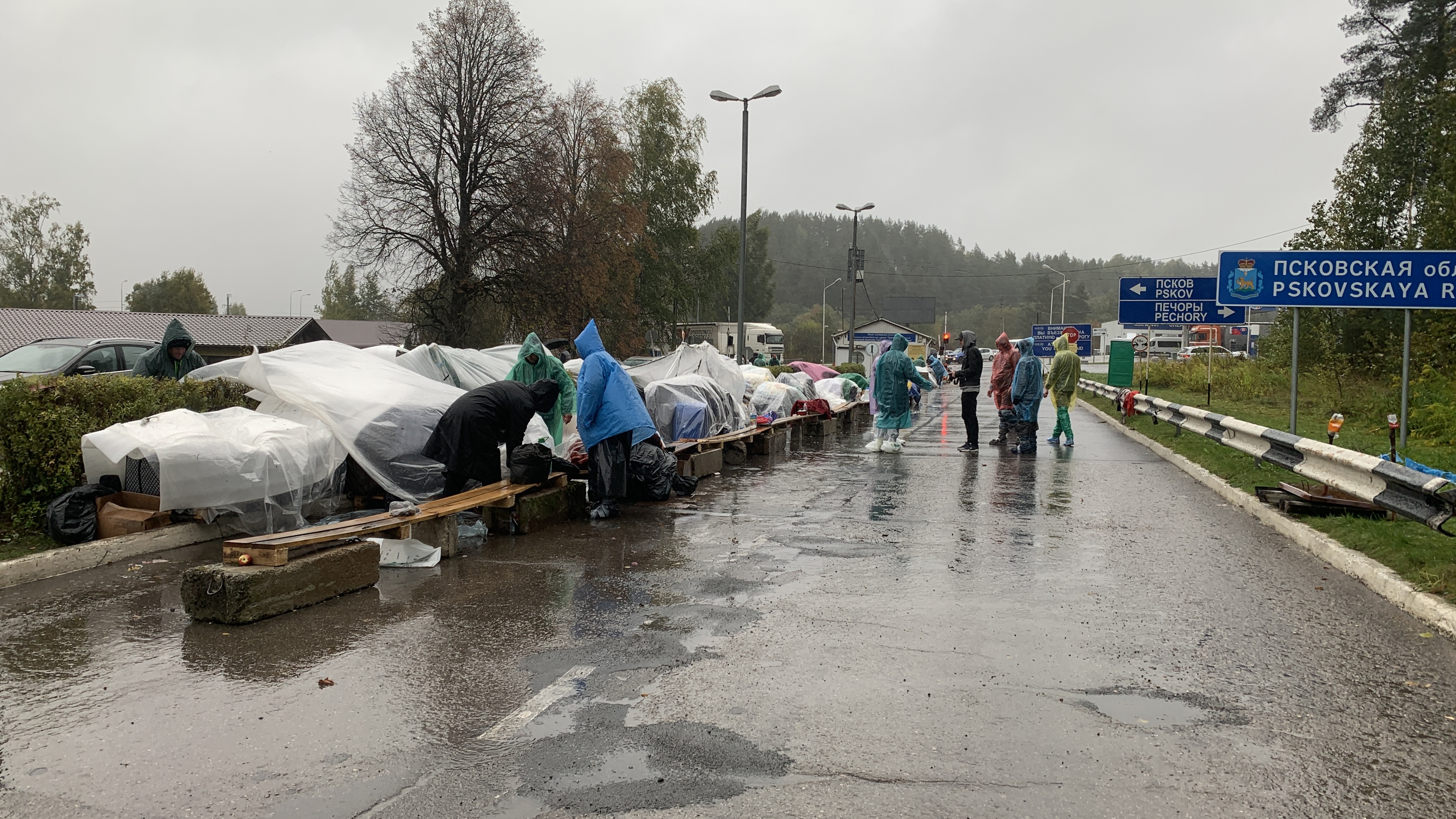 – Я был на границе в Шумилкино, – продолжает Леонид. – Нас привезли туда, километр я прошел, очереди такие стоят. Я хотел просто спросить (у пограничников), так меня чуть не побили. Говорят, что если за эту белую черту зайдешь, они закрывают на четыре часа переход просто как наказание. Меня там чуть не избили, я вот сюда приехал. Я промониторил, говорили, что здесь 150 человек, но я ошибся, тут очень много людей. Правда сейчас из-за дождя все разошлись, а мы не можем, мы первые в очереди. Дождь пошел в пять утра и не прекращается, а прошло всего десять человек за десять часов. Это что, работа государственной границы? Выходил тут начальник: "Все будет хорошо, это просто принцип пробки". Просто отфутболил. Подполковник.