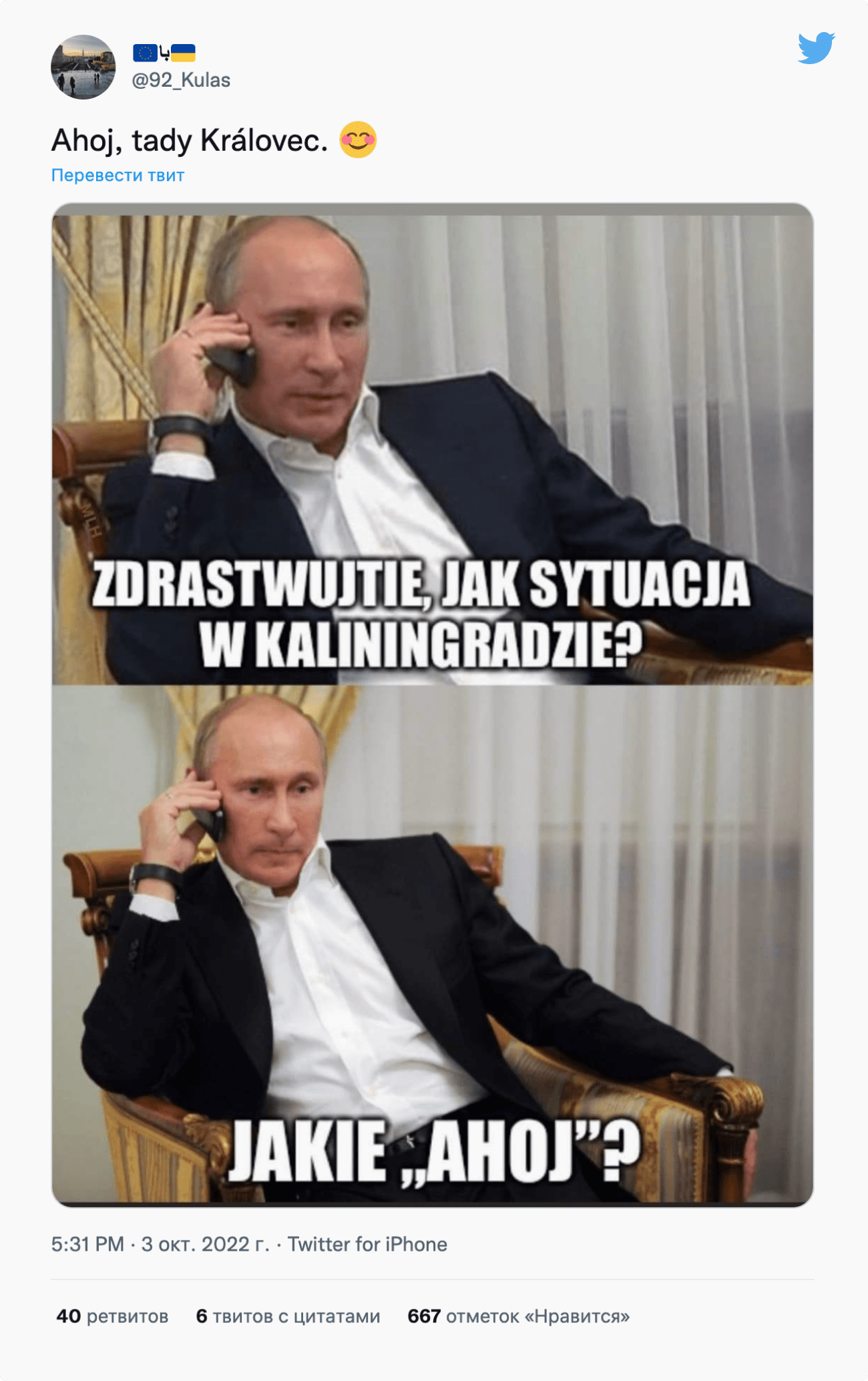 И тогда Краловец зажил своей жизнью. Например, у него появился собственный сайт, на котором можно увидеть карту нового чешского региона (на ней бывший Зеленоградск называется Зеленскоградском). И разумеется, в огромном количестве завирусились мемы. Причем не только чешские, но и на польском языке — вероятно, потому что одна из первых шуток про то, что Калининград нужно отдать чехам (она набрала уже больше 30 тысяч лайков), была именно на нем: