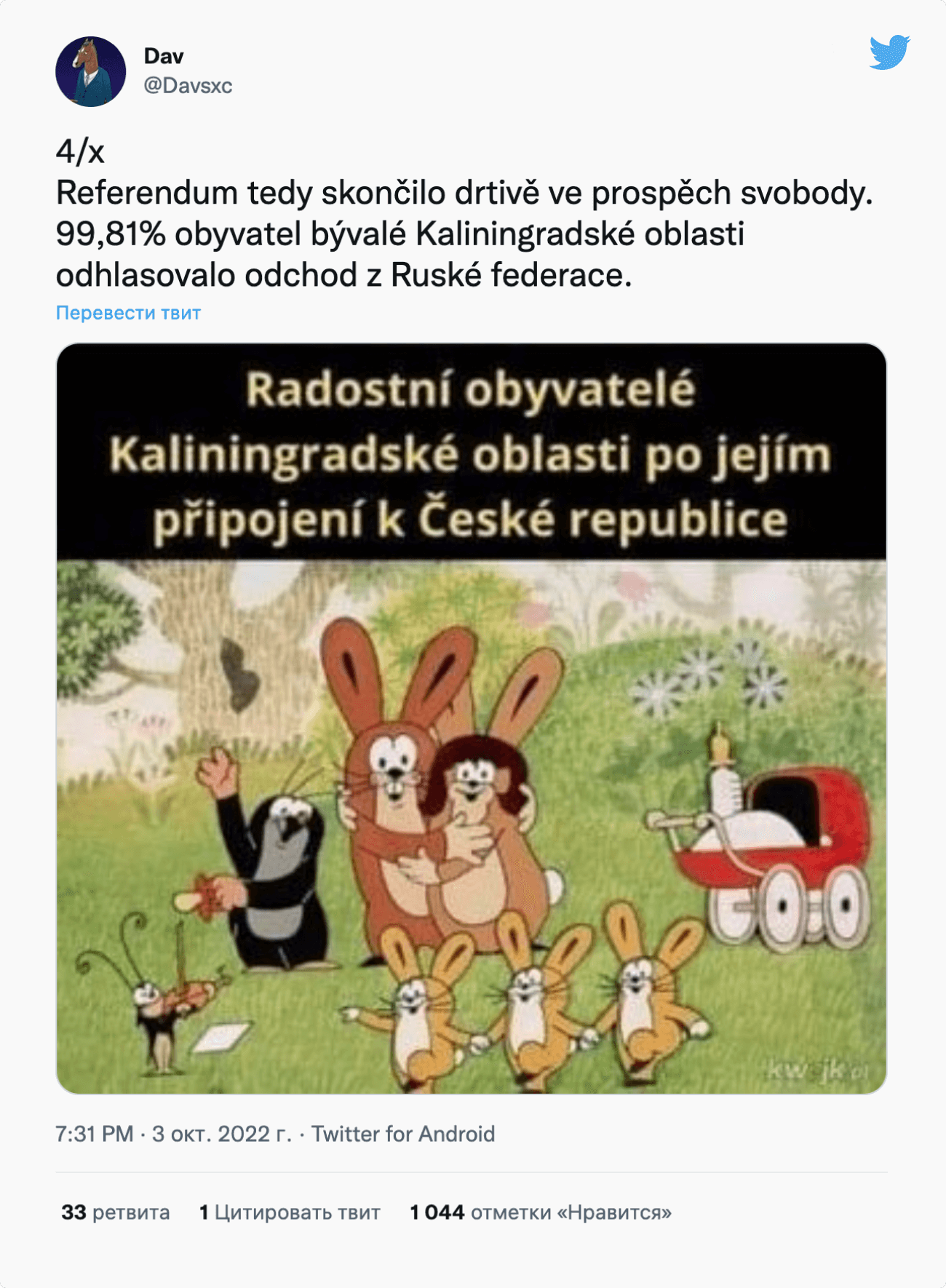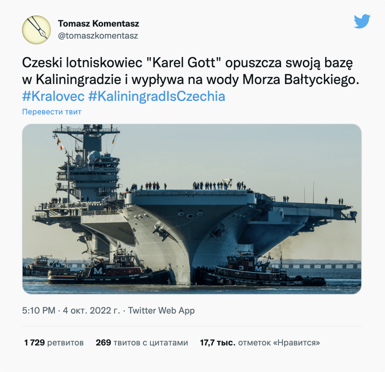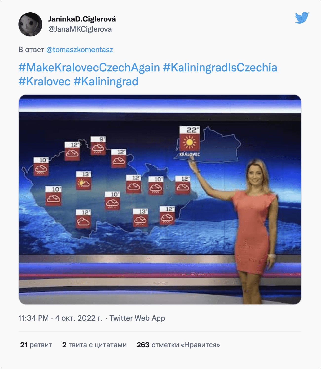 27 сентября, после того, как в частично оккупированных украинских регионах прошли «референдумы о присоединении к России», на сайте электронных петиций petice.com появилось новое сообщение. Его автор утверждает, что благодаря примеру России у Чехии «появилась уникальная возможность расширить свою территорию и наконец получить выход к морю». Петиция требует от властей Чехии ввести войска в Калининград, провести там референдум о присоединении (с результатом 98% голосов «за»), а затем аннексировать эту область и переименовать Калининград в Краловец. Эту петицию подписали уже больше 16 тысяч пользователей.