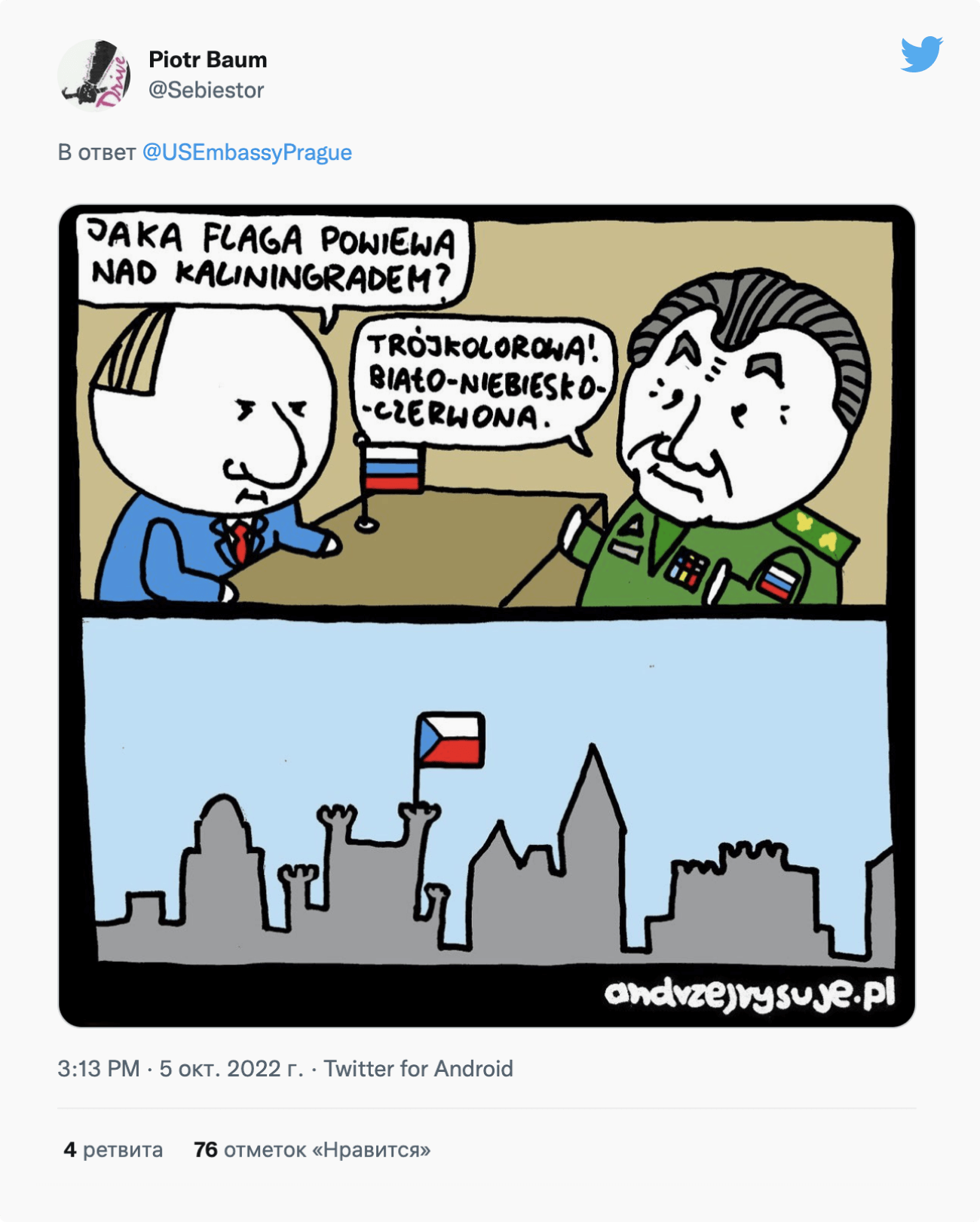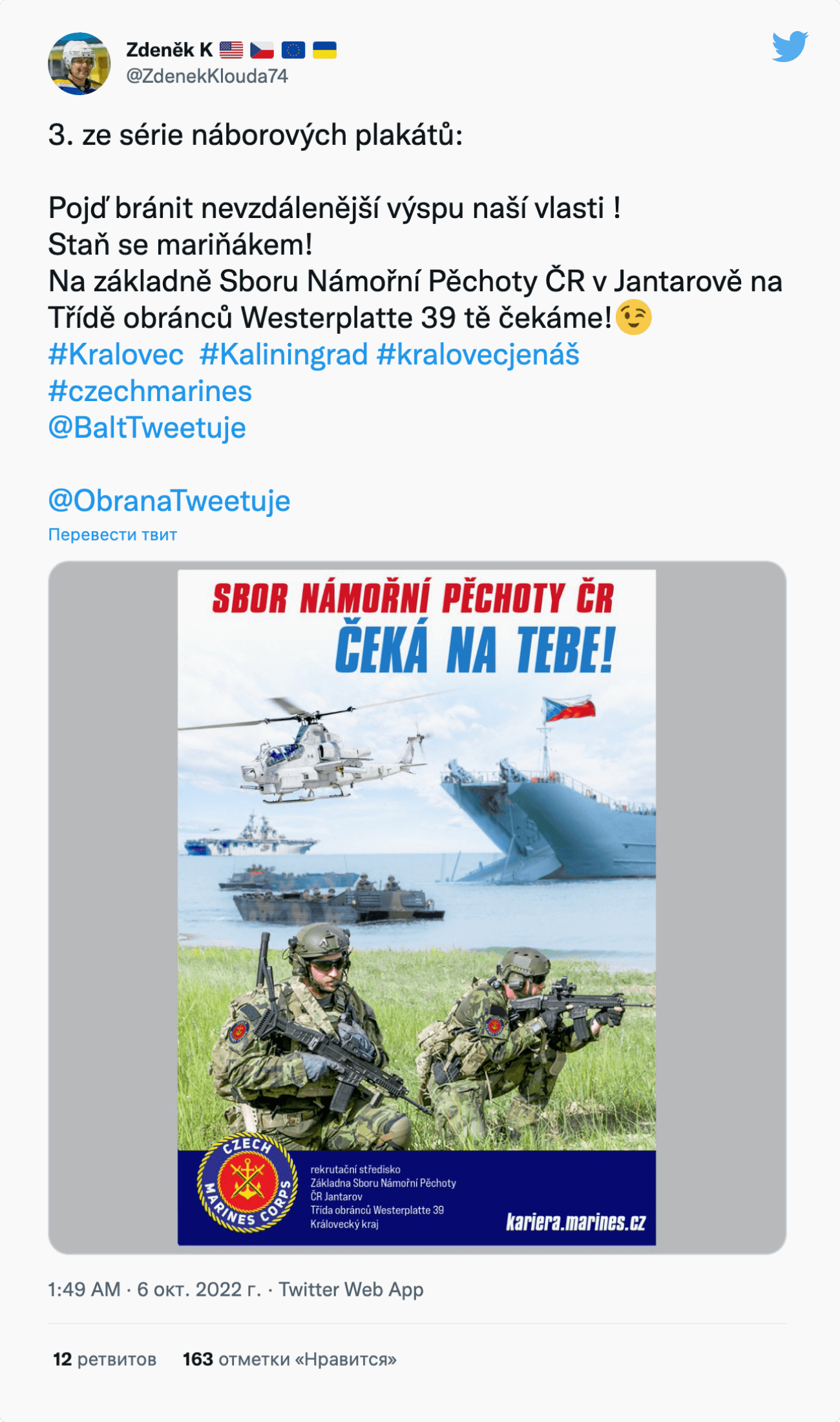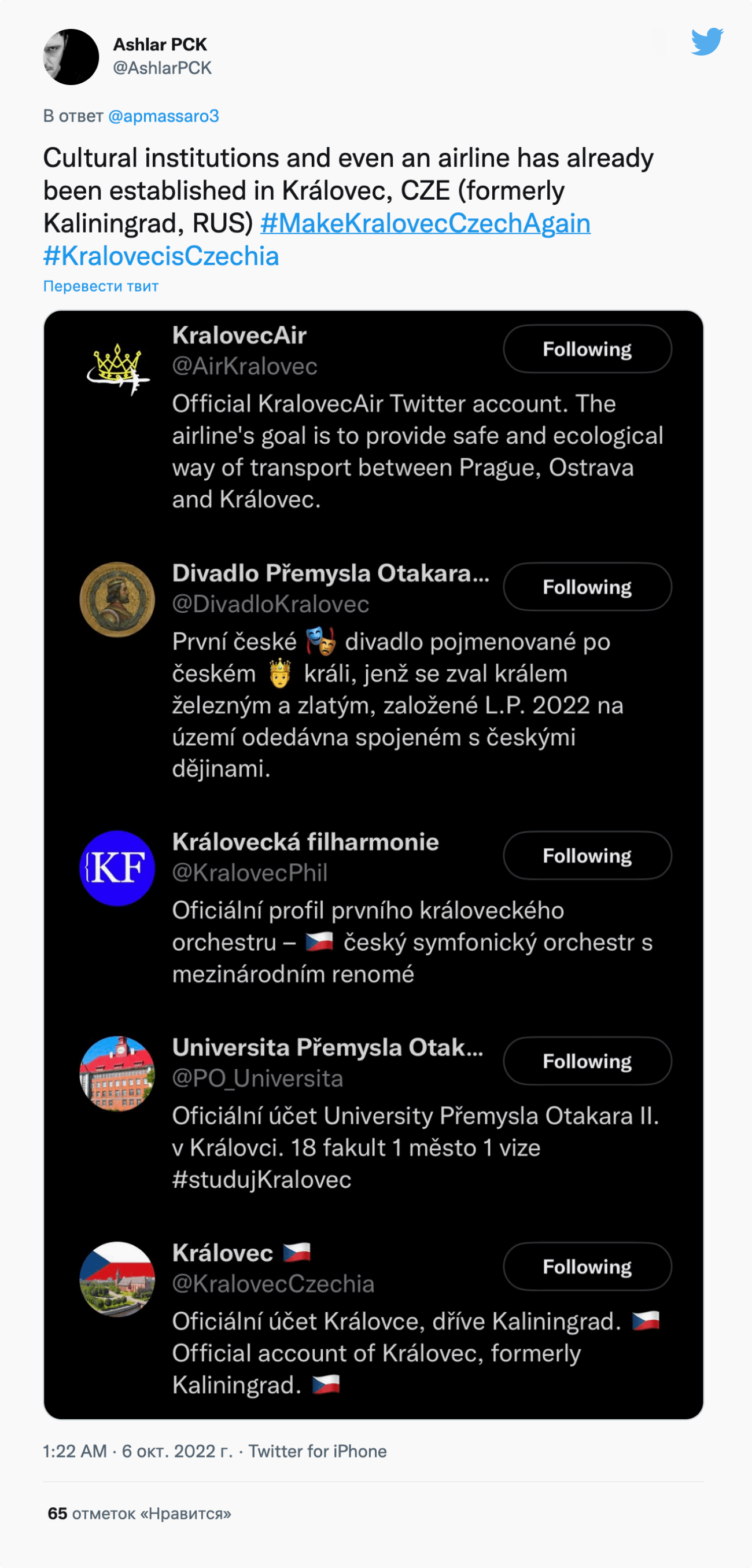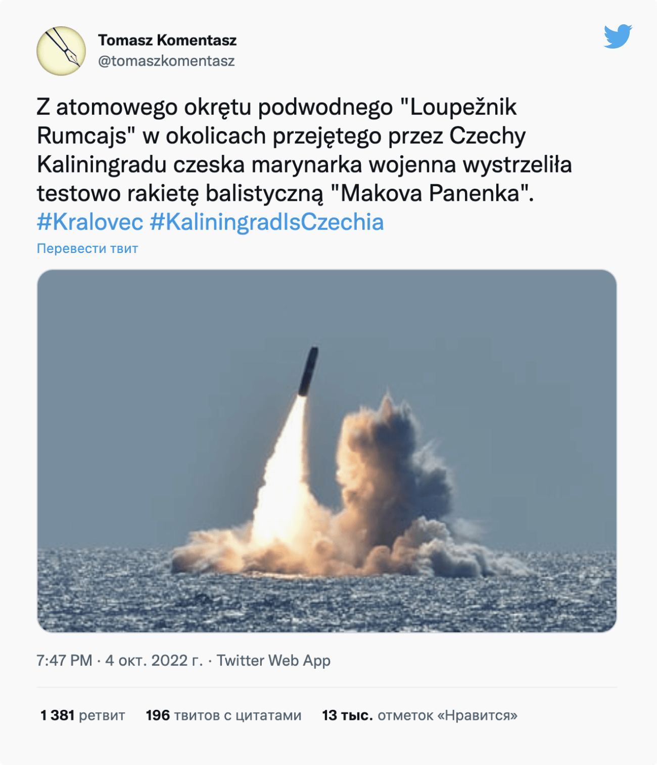 27 сентября, после того, как в частично оккупированных украинских регионах прошли «референдумы о присоединении к России», на сайте электронных петиций petice.com появилось новое сообщение. Его автор утверждает, что благодаря примеру России у Чехии «появилась уникальная возможность расширить свою территорию и наконец получить выход к морю». Петиция требует от властей Чехии ввести войска в Калининград, провести там референдум о присоединении (с результатом 98% голосов «за»), а затем аннексировать эту область и переименовать Калининград в Краловец. Эту петицию подписали уже больше 16 тысяч пользователей.