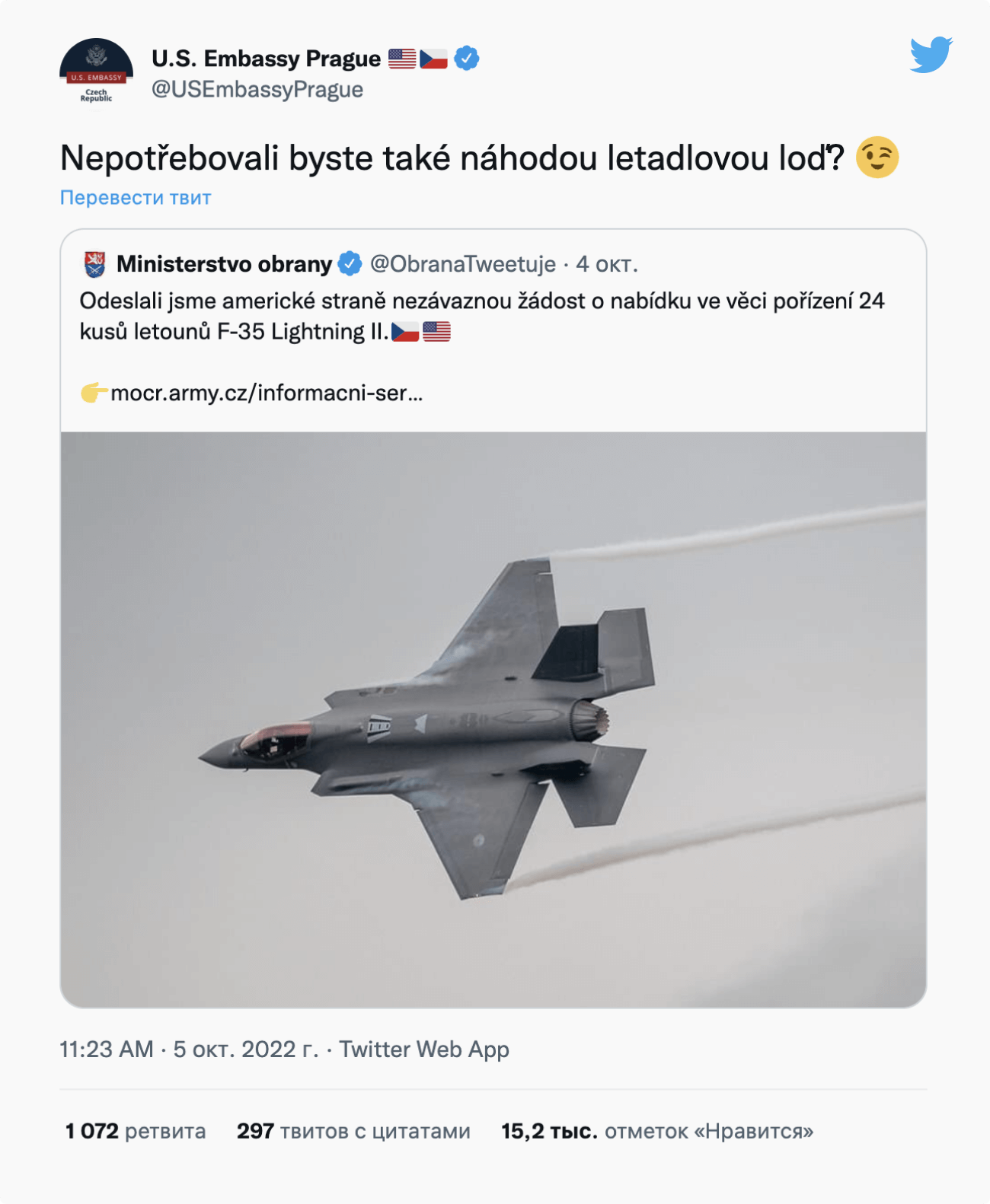 К шуткам про Чехию — морскую державу присоединилось и посольство США в Чехии, которое процитировало твит чешского министерства обороны (настоящего) о закупке истребителей F-35: