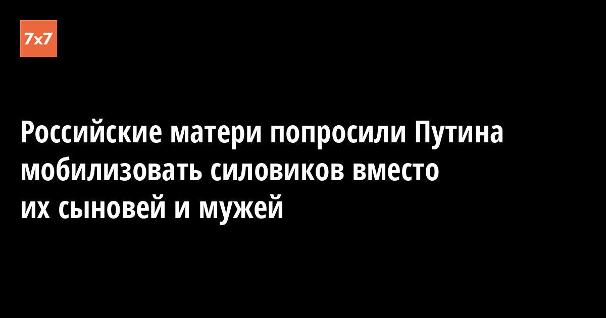 Российский Совет матерей отправил Владимиру Путину обращение с просьбой мобилизовать силовиков вместо их сыновей и мужей. По их мнению, силовики должны исполнить свой профессиональный долг и подготовлены лучше, чем мужчины в запасе. Об этом написали в Telegram-канале «ОСВР Совет матерей и жен».