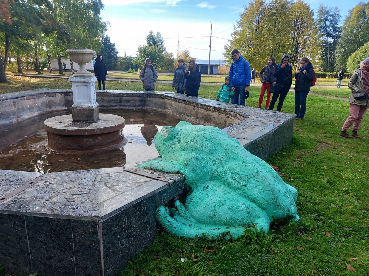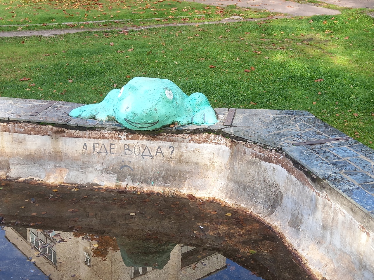 Приморск производит впечатление сонного города, где ничего не работает и ничего не происходит. Даже фонтан вот замолк. На замолкший фонтан смотрит грустная лягушка.
