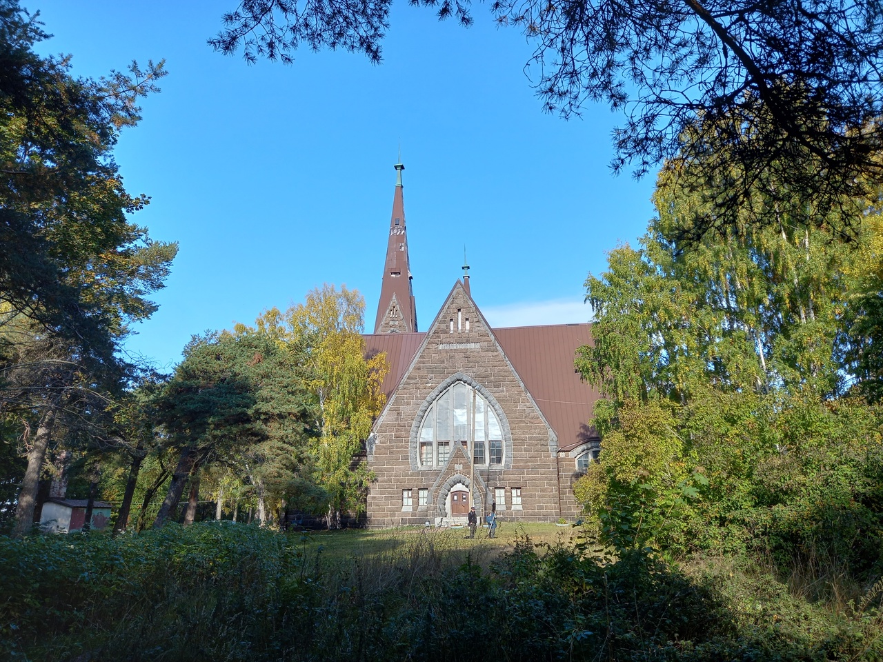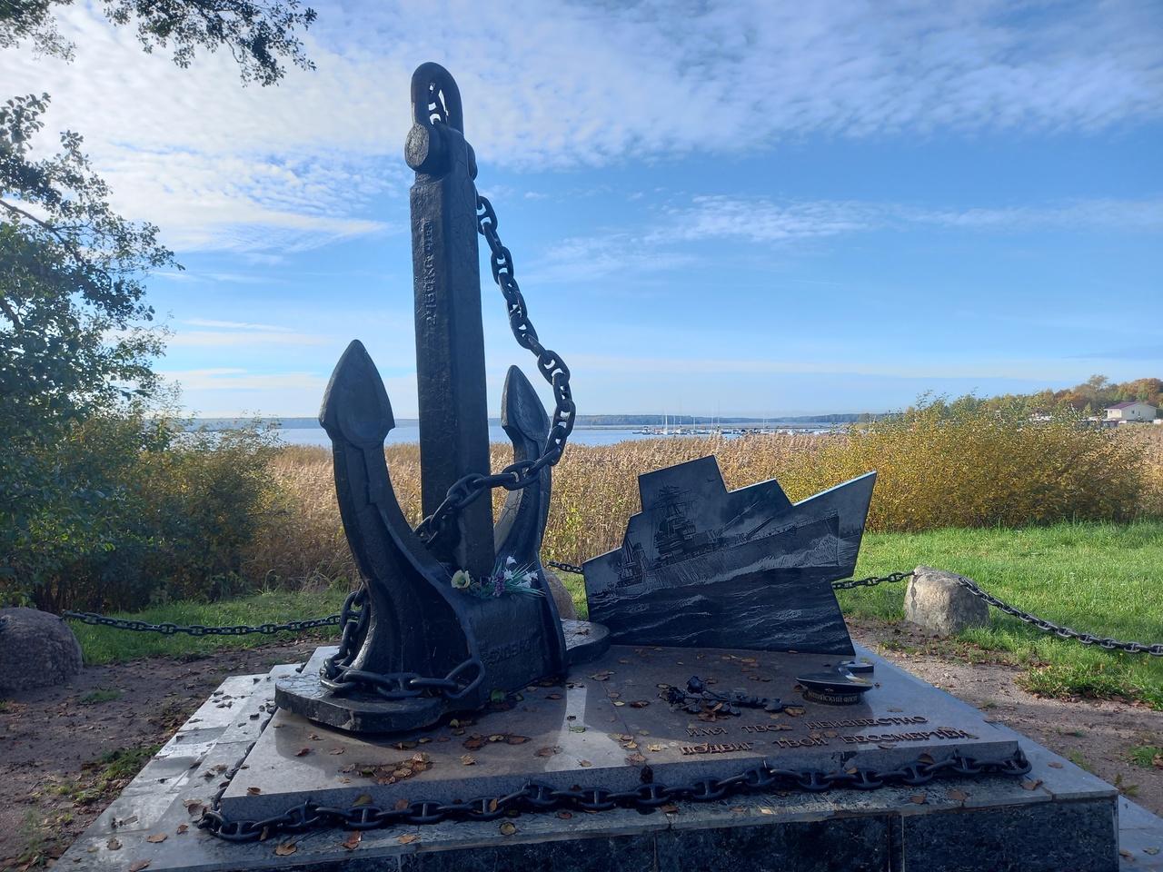 Перед кирхой памятник в виде паруса с крестом - памятник погибшим (и русским, и финнам) в знак их посмертного примирения.